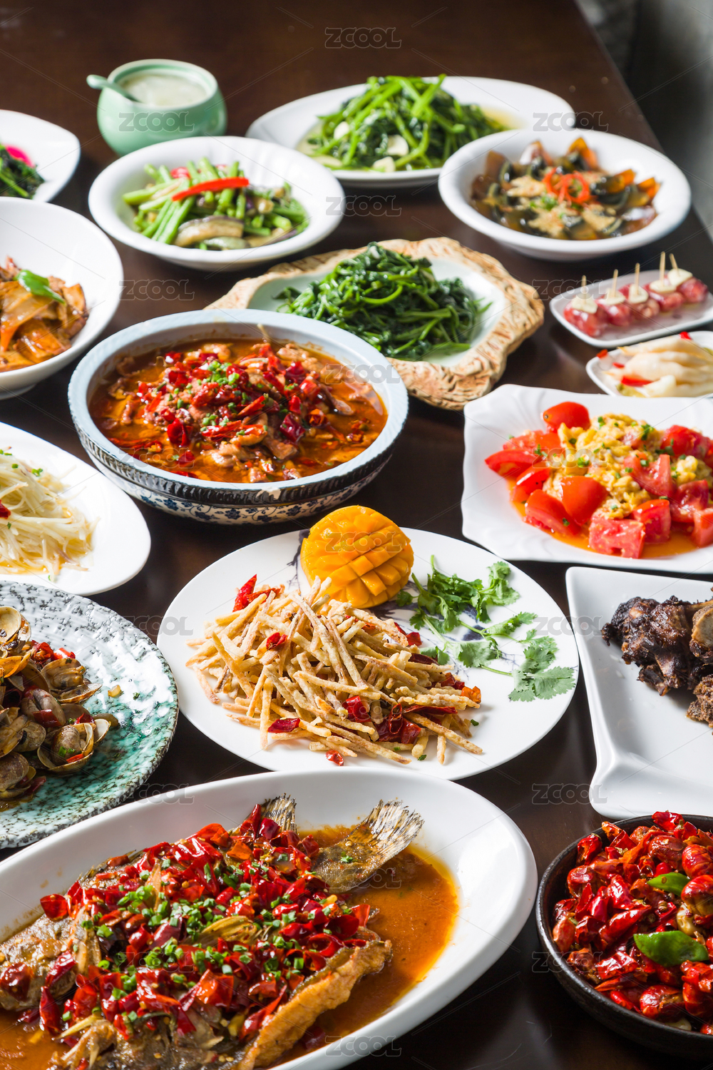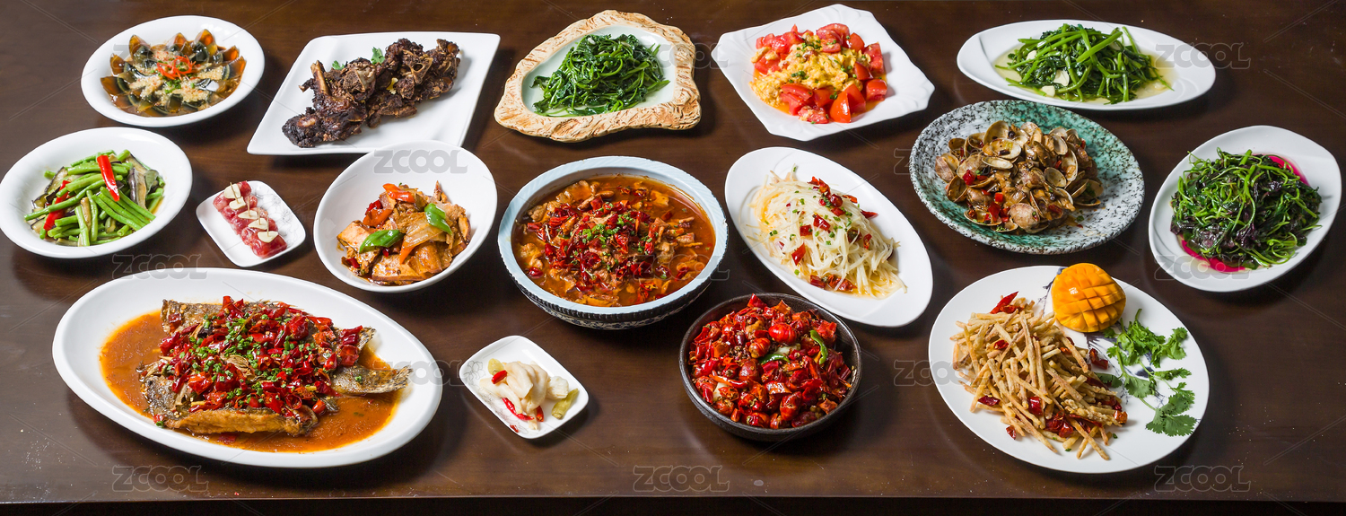 把實(shí)木餐桌擺滿的各種佳肴
