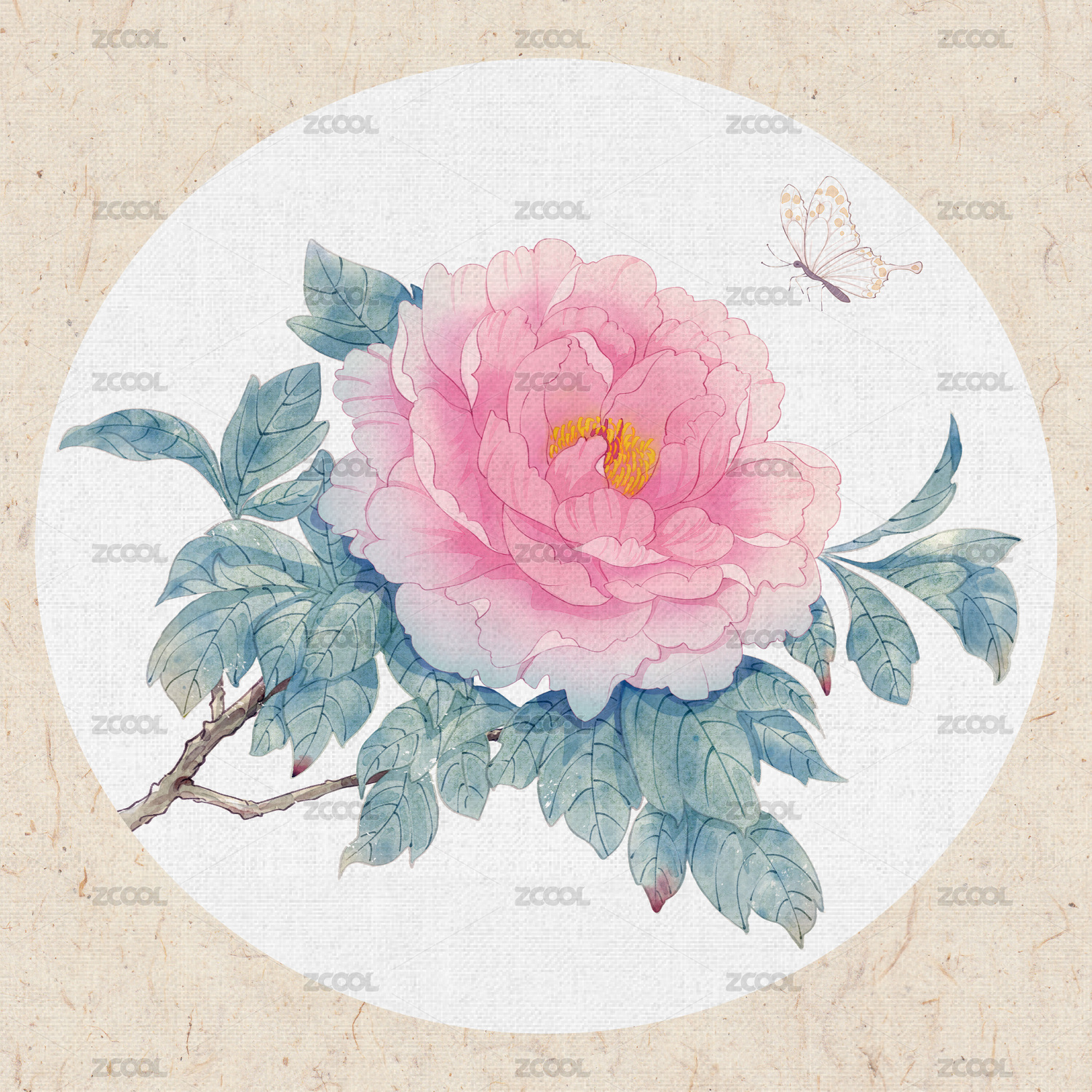 粉色牡丹花配蝴蝶的工筆水墨水彩裝飾畫