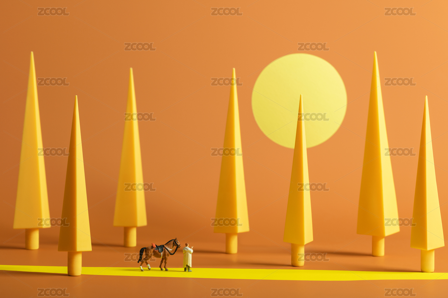 微縮創(chuàng)意抽象秋天黃樹林看夕陽的人與馬