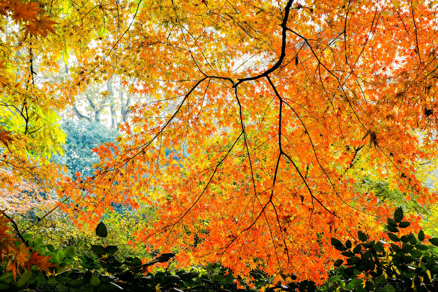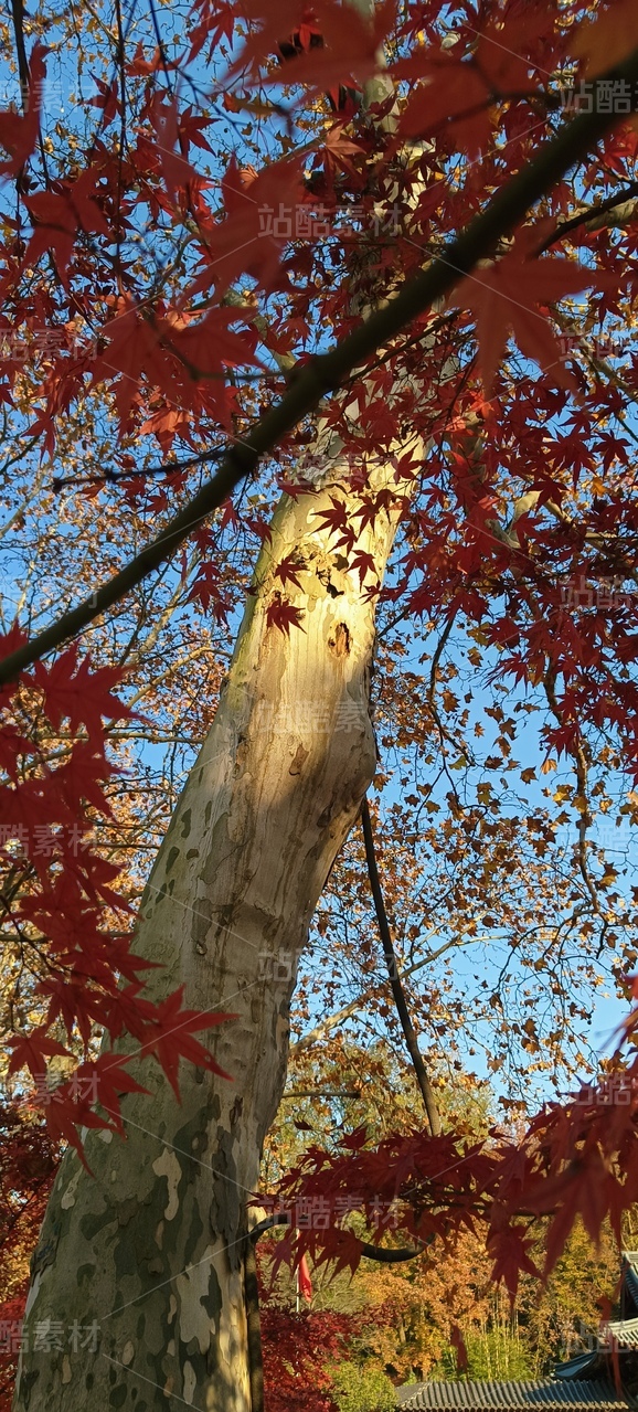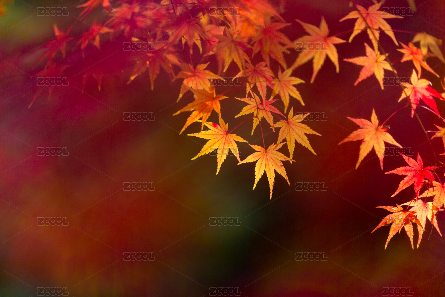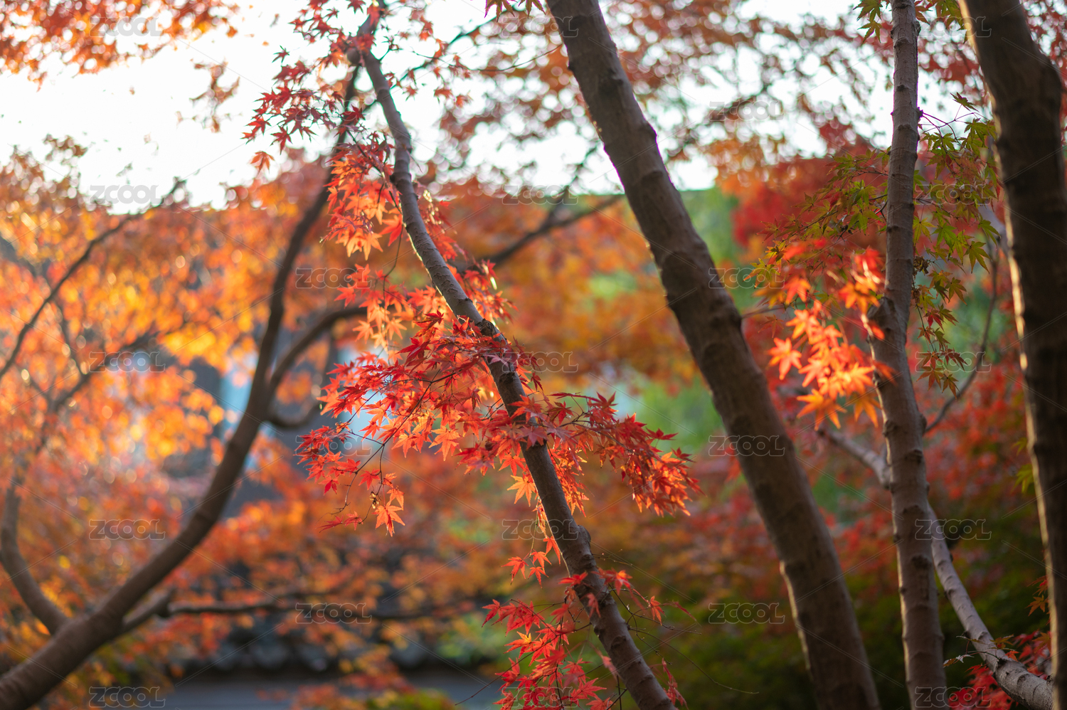 側逆光下朦朧背景前的楓樹與大片紅楓