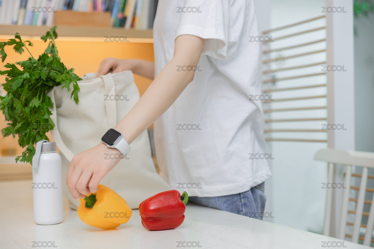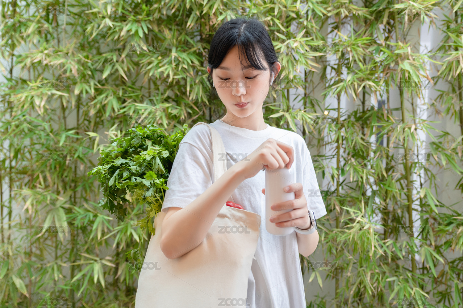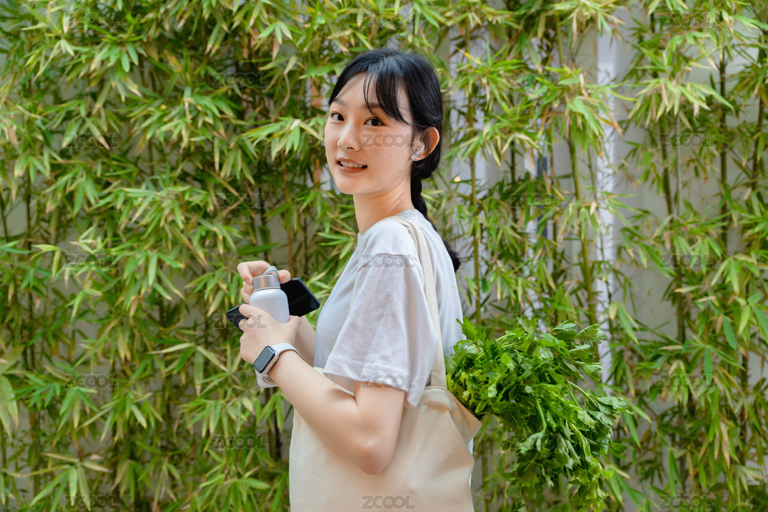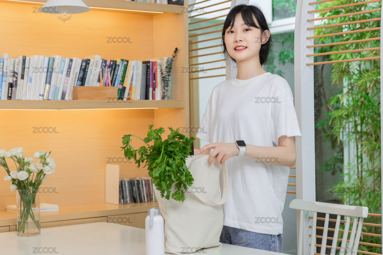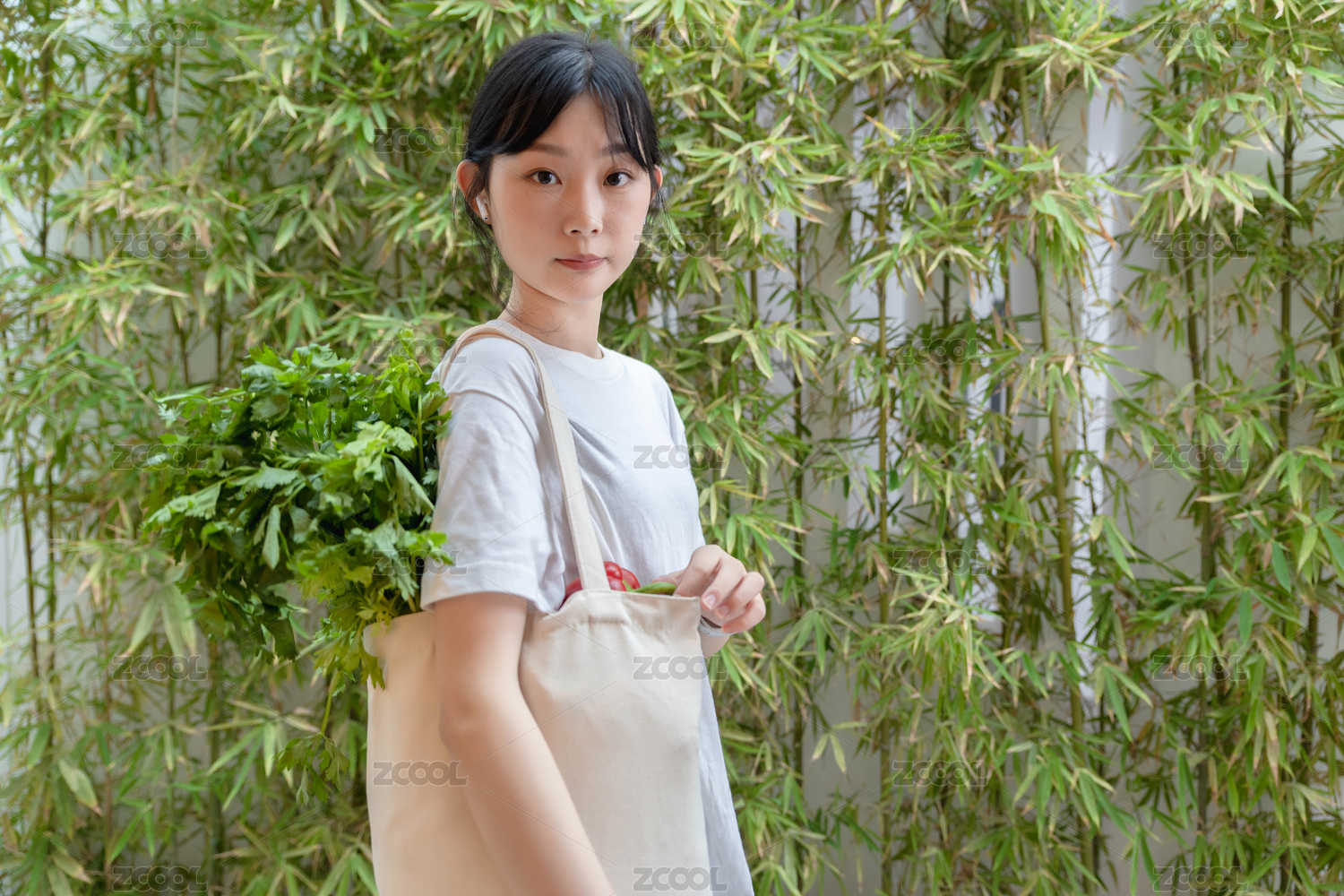 美麗清純的亞洲女孩,用帆布包裝著蔬菜的,