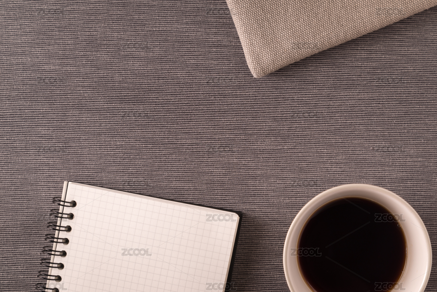 筆記本、咖啡杯和帆布包放在灰色書桌上