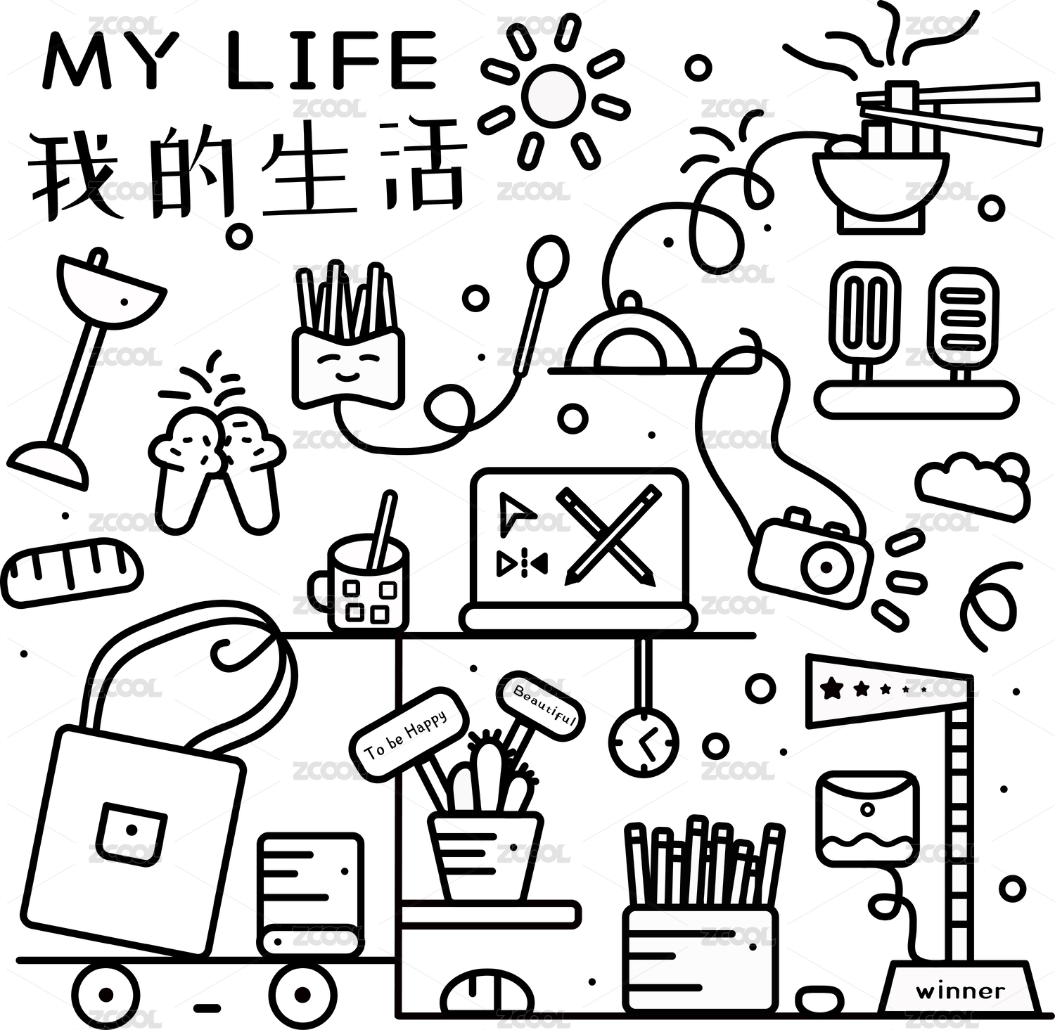 插畫線條我的生活面條薯?xiàng)l日常帆布包筆記