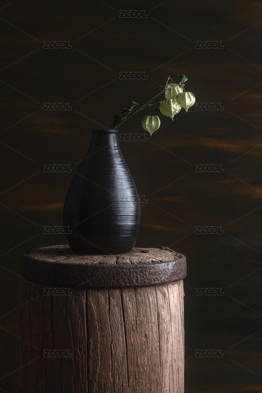 青色的紅姑娘干花插在黑色花瓶中的靜物圖