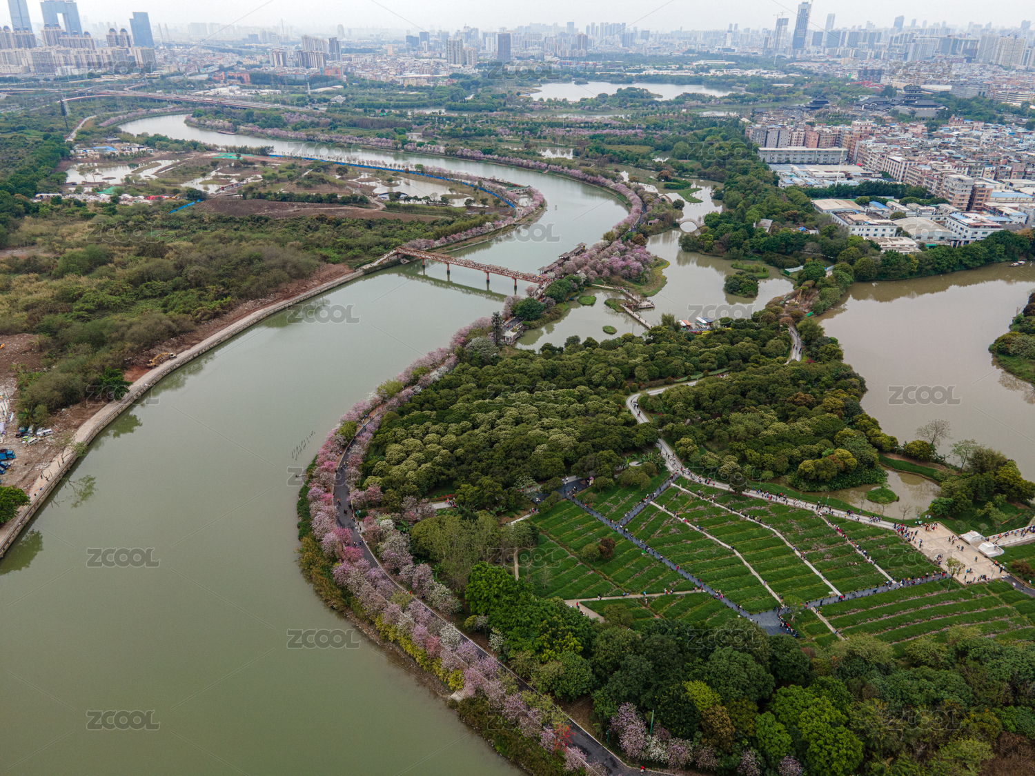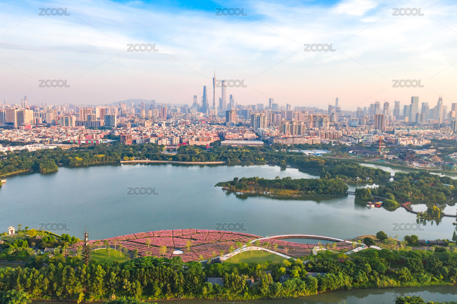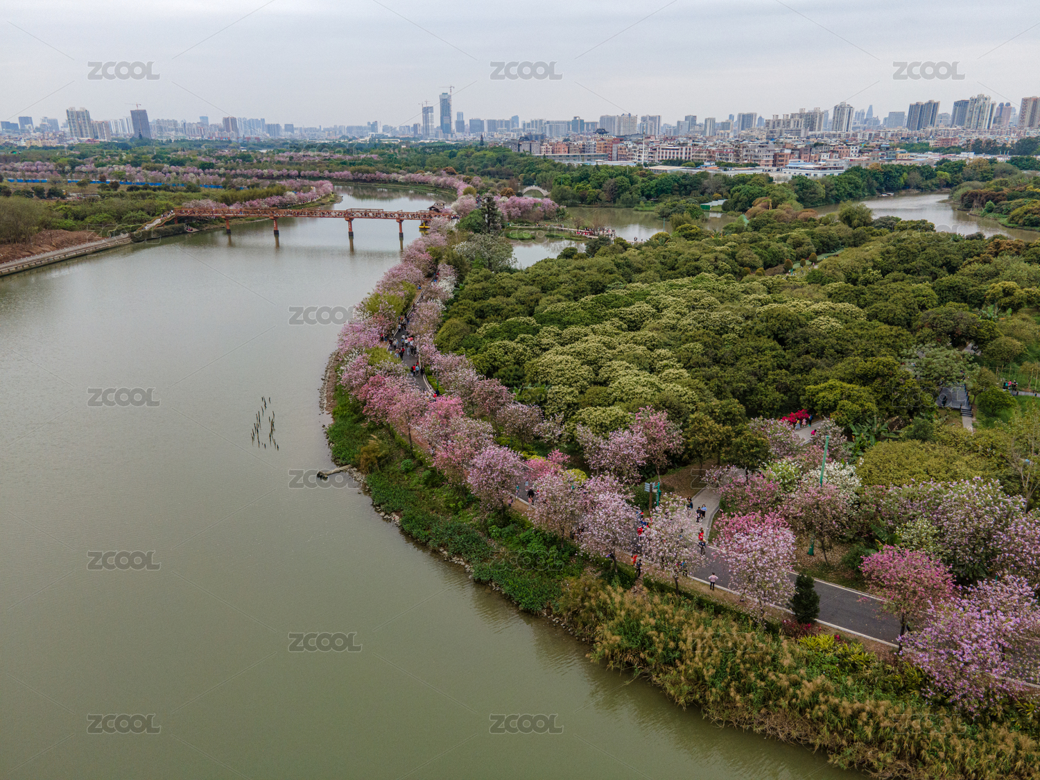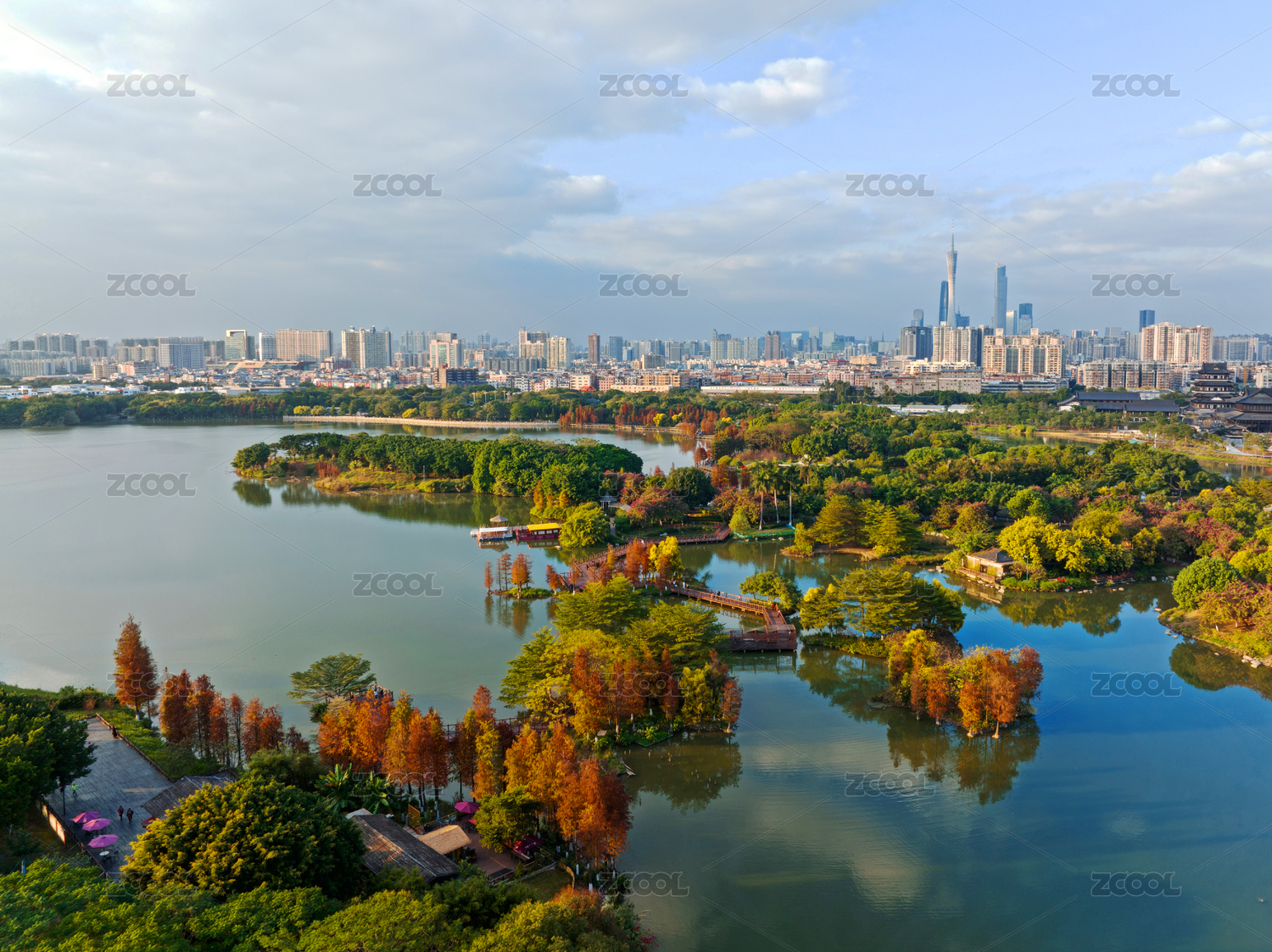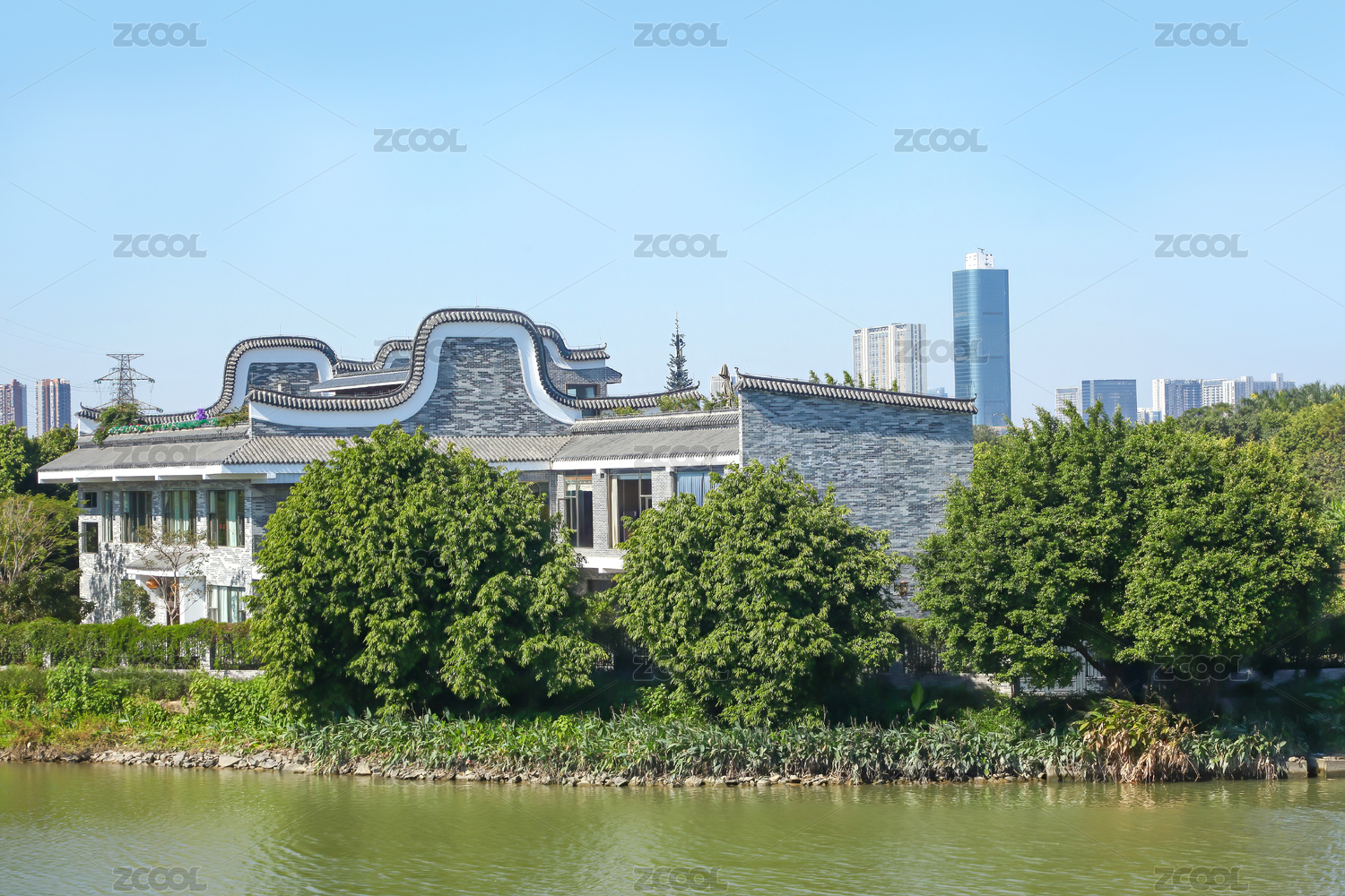 廣州海珠濕地公園湖泊河流與涼亭走廊