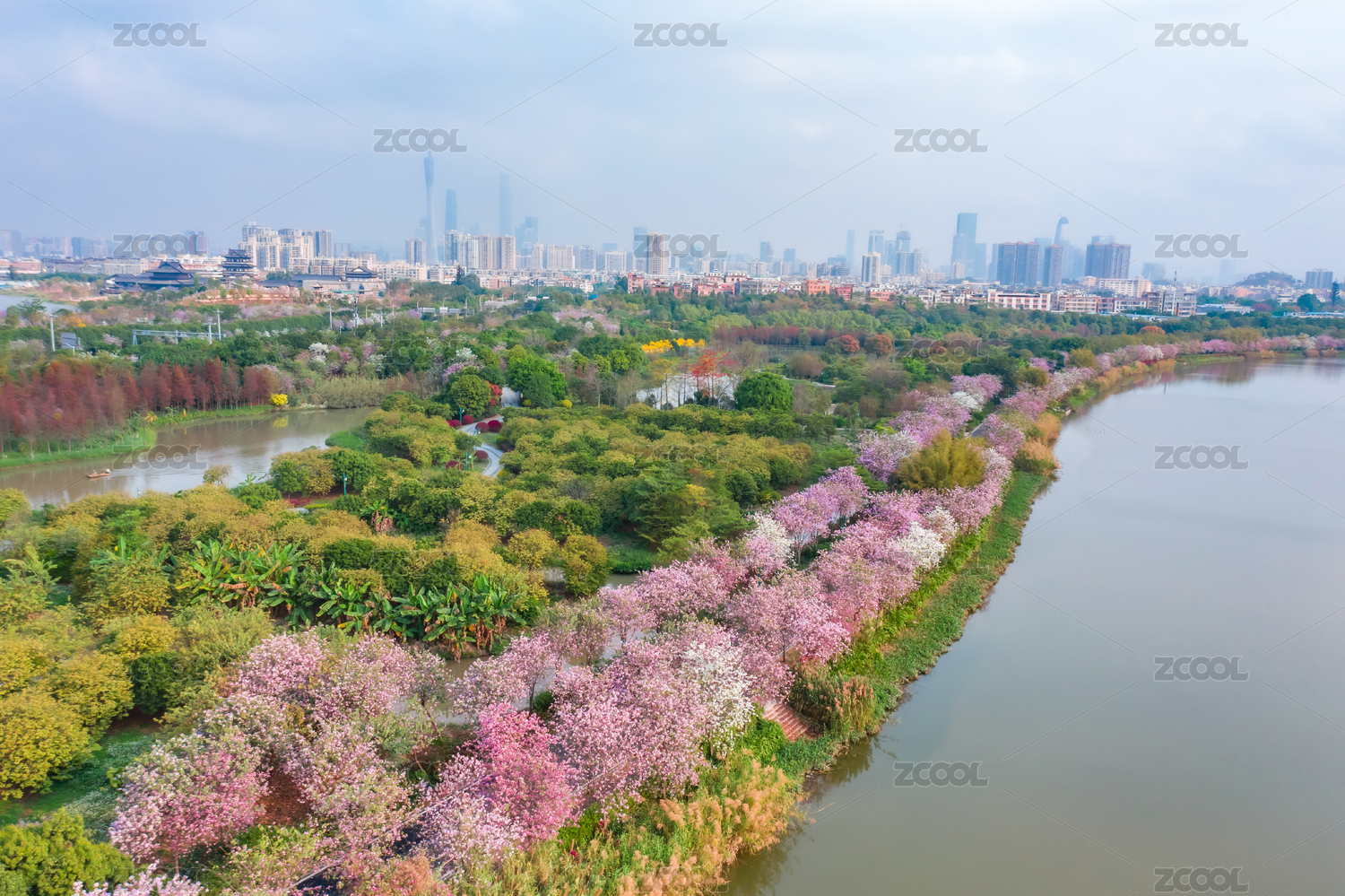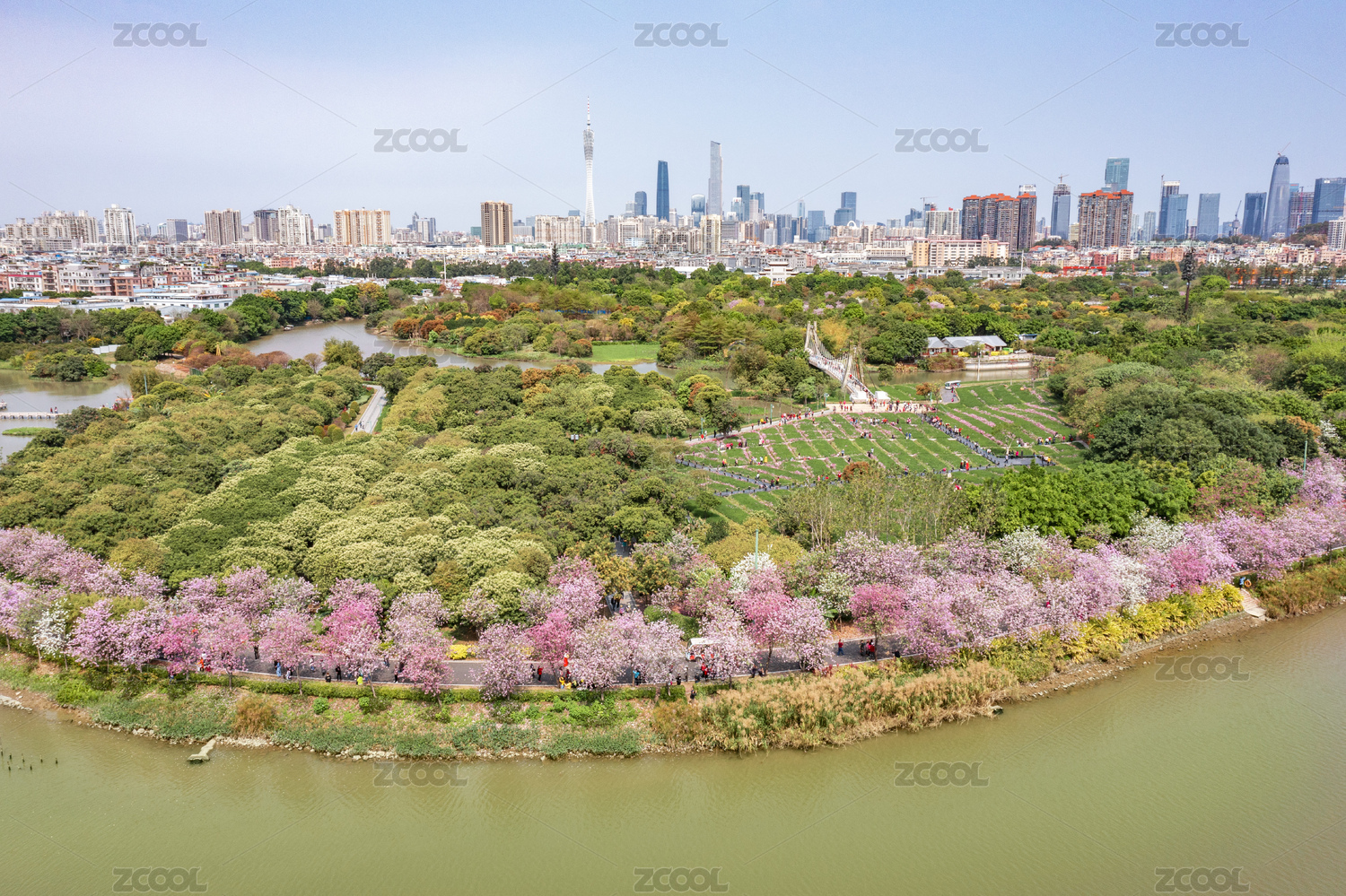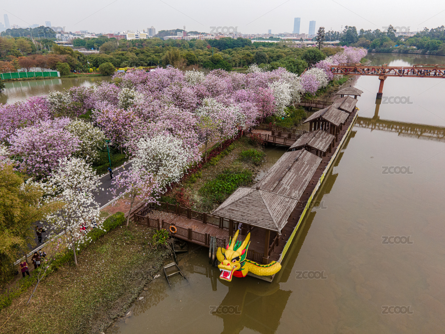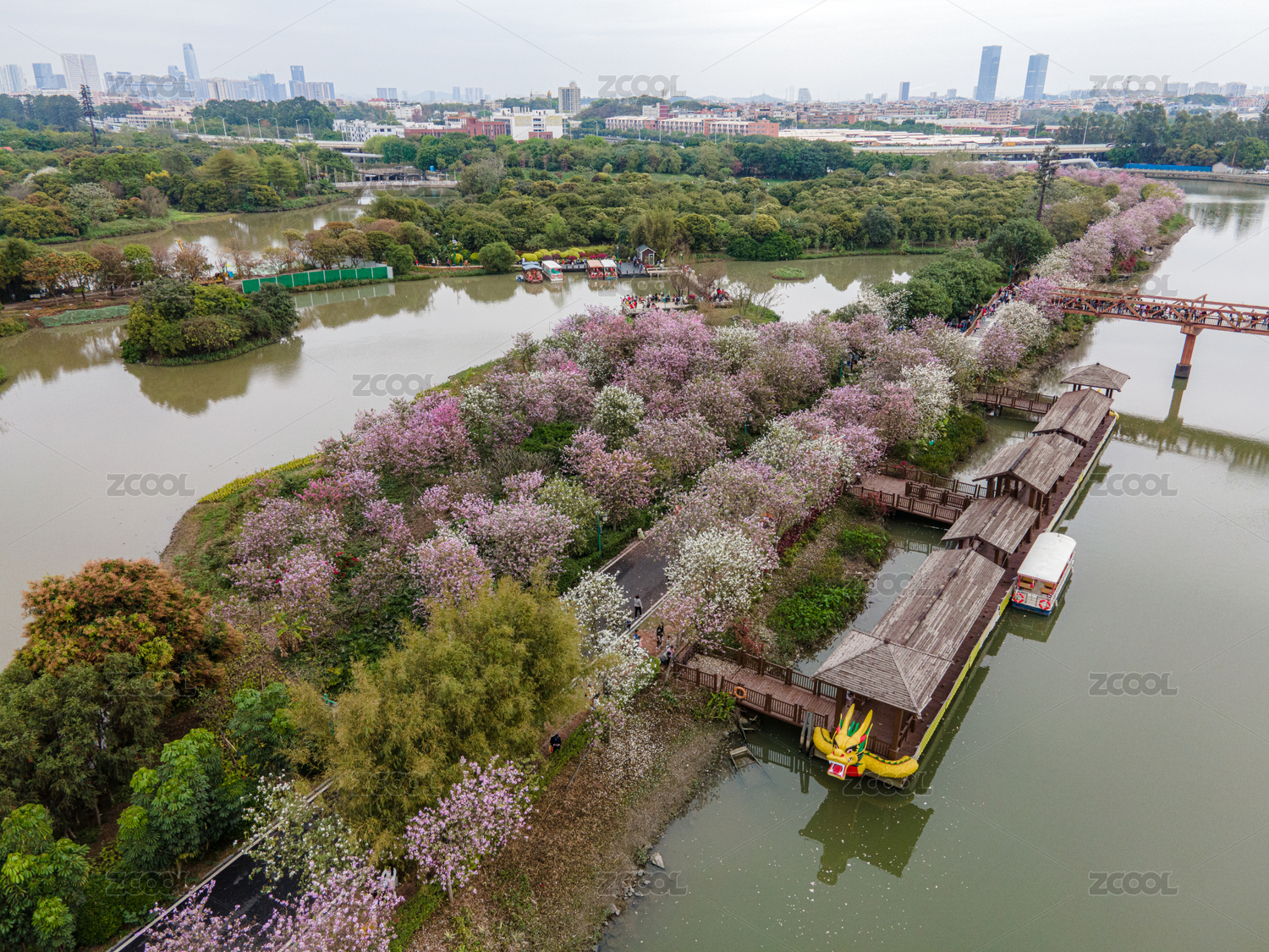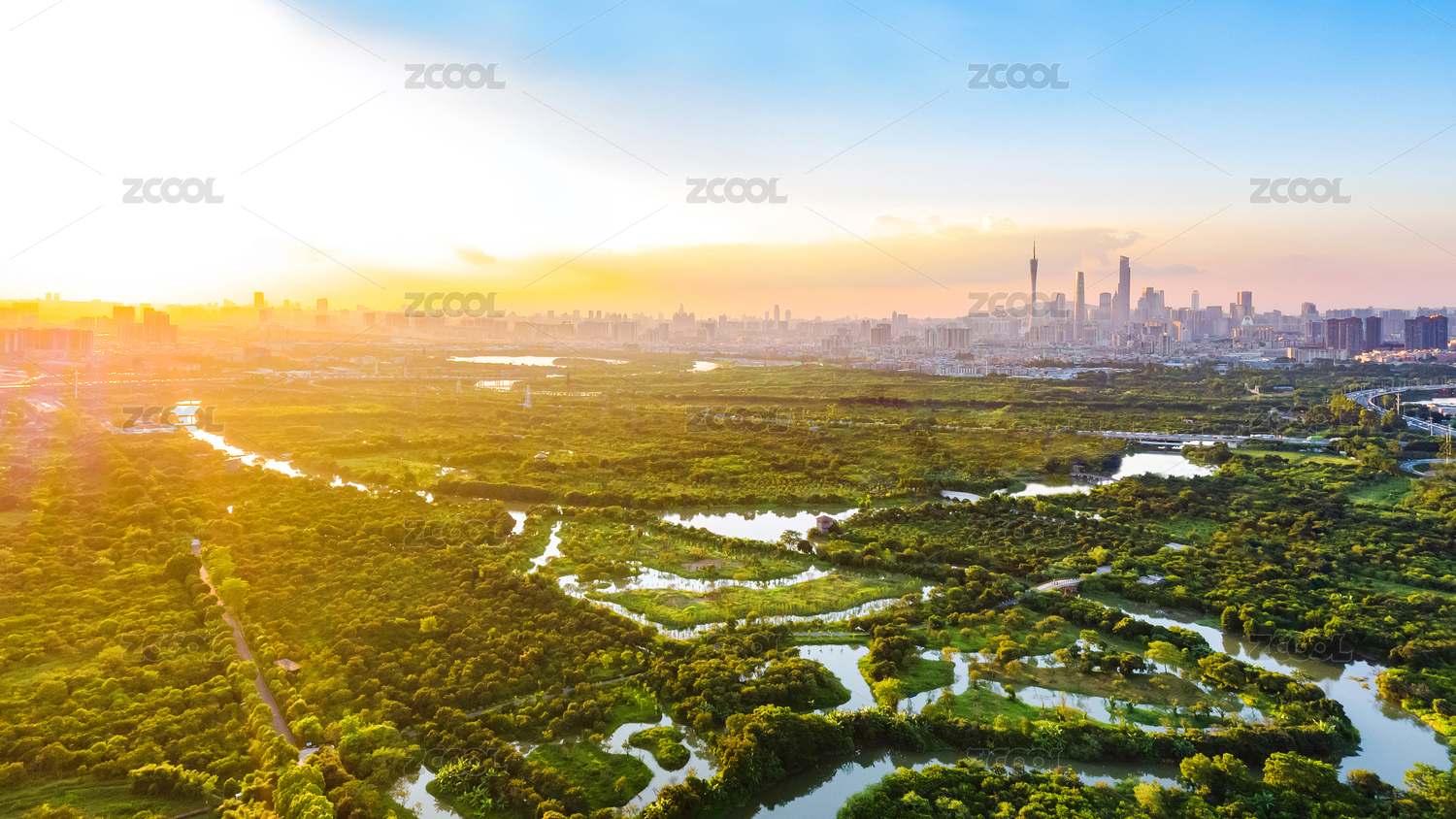 廣州海珠濕地公園湖泊河流與涼亭走廊