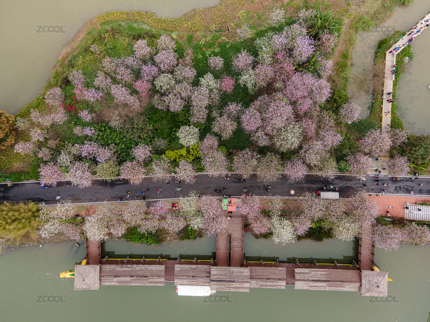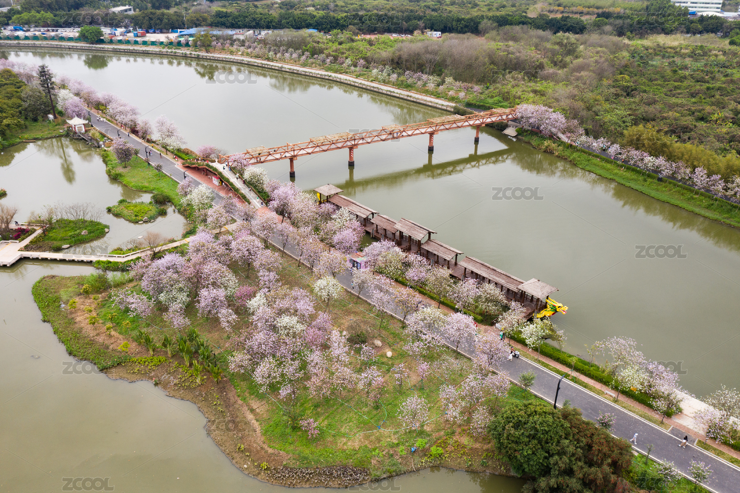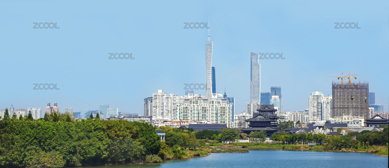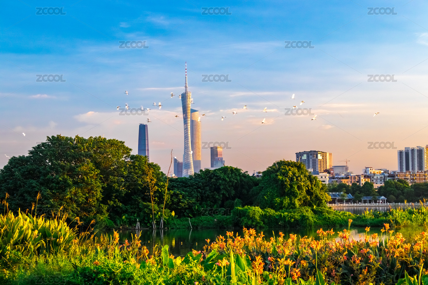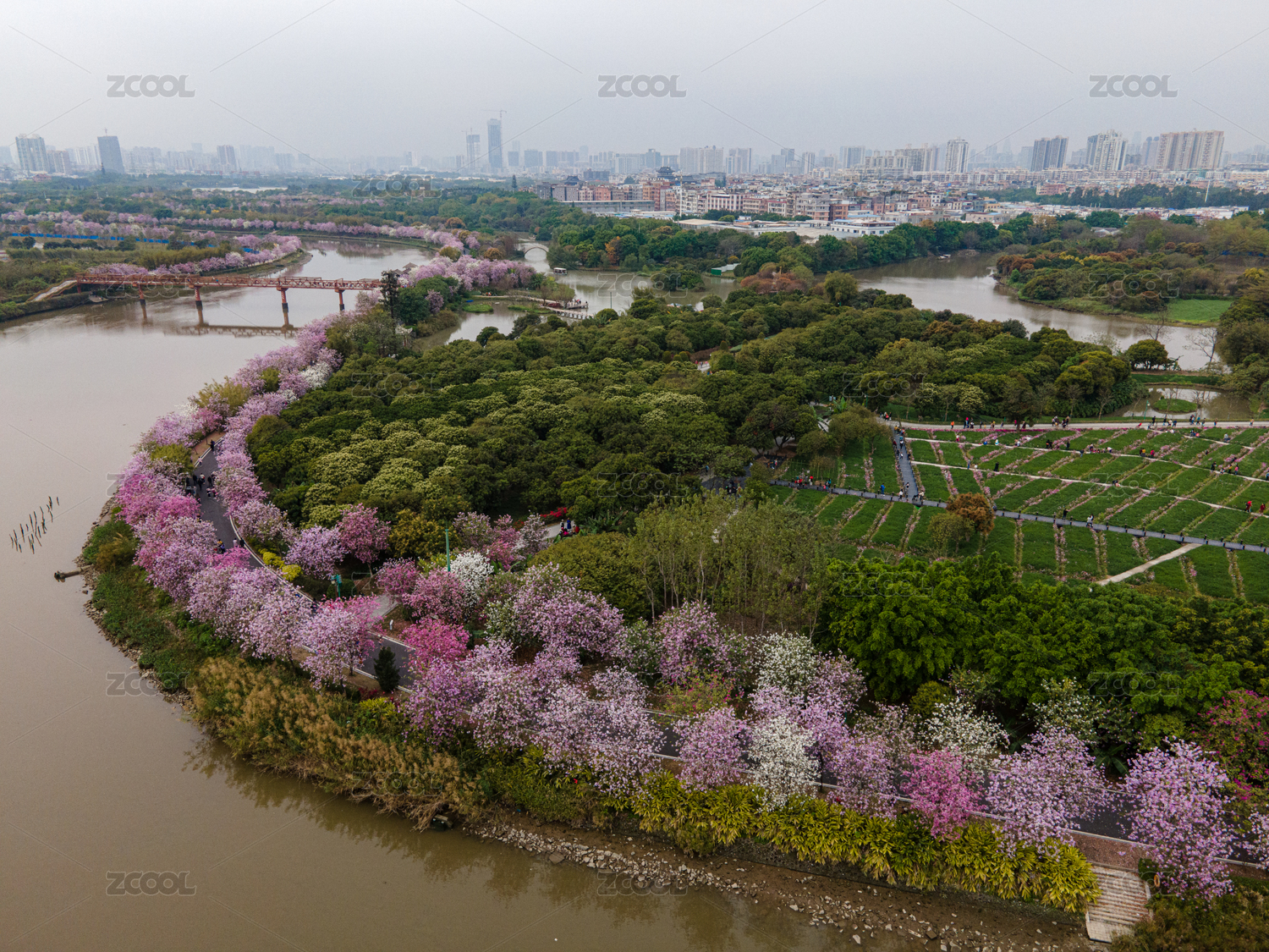廣州海珠濕地公園湖泊河流與涼亭走廊