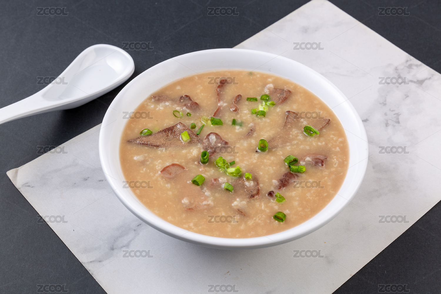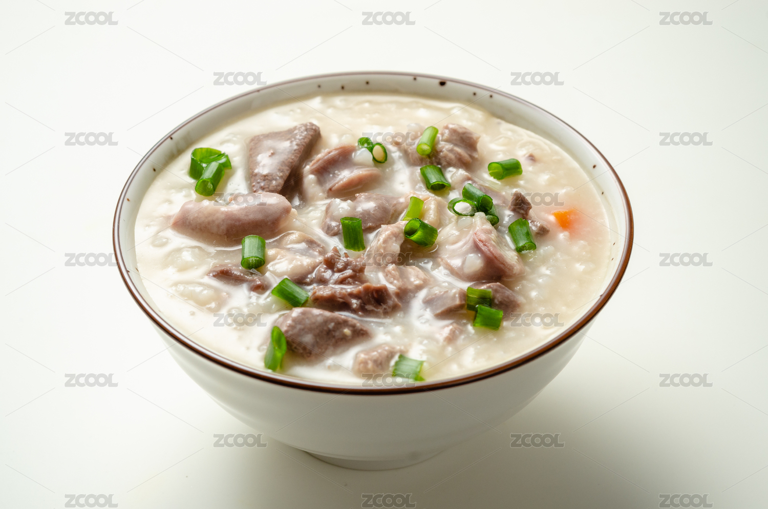 放在白色桌面上的一碗中國廣東風味美食——新鮮豬雜粥(側面圖)