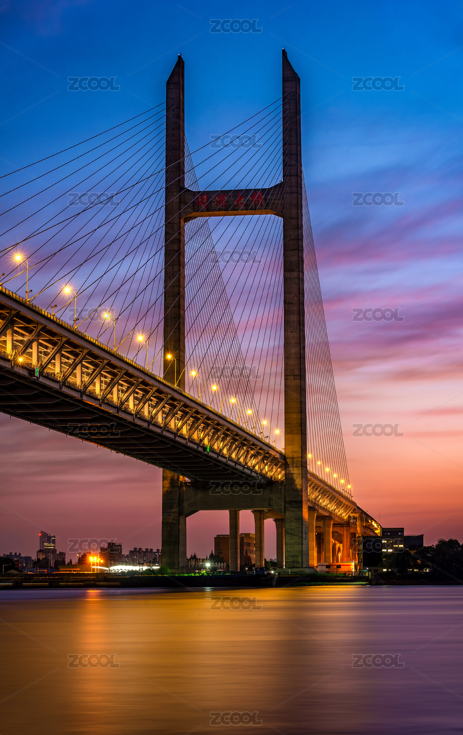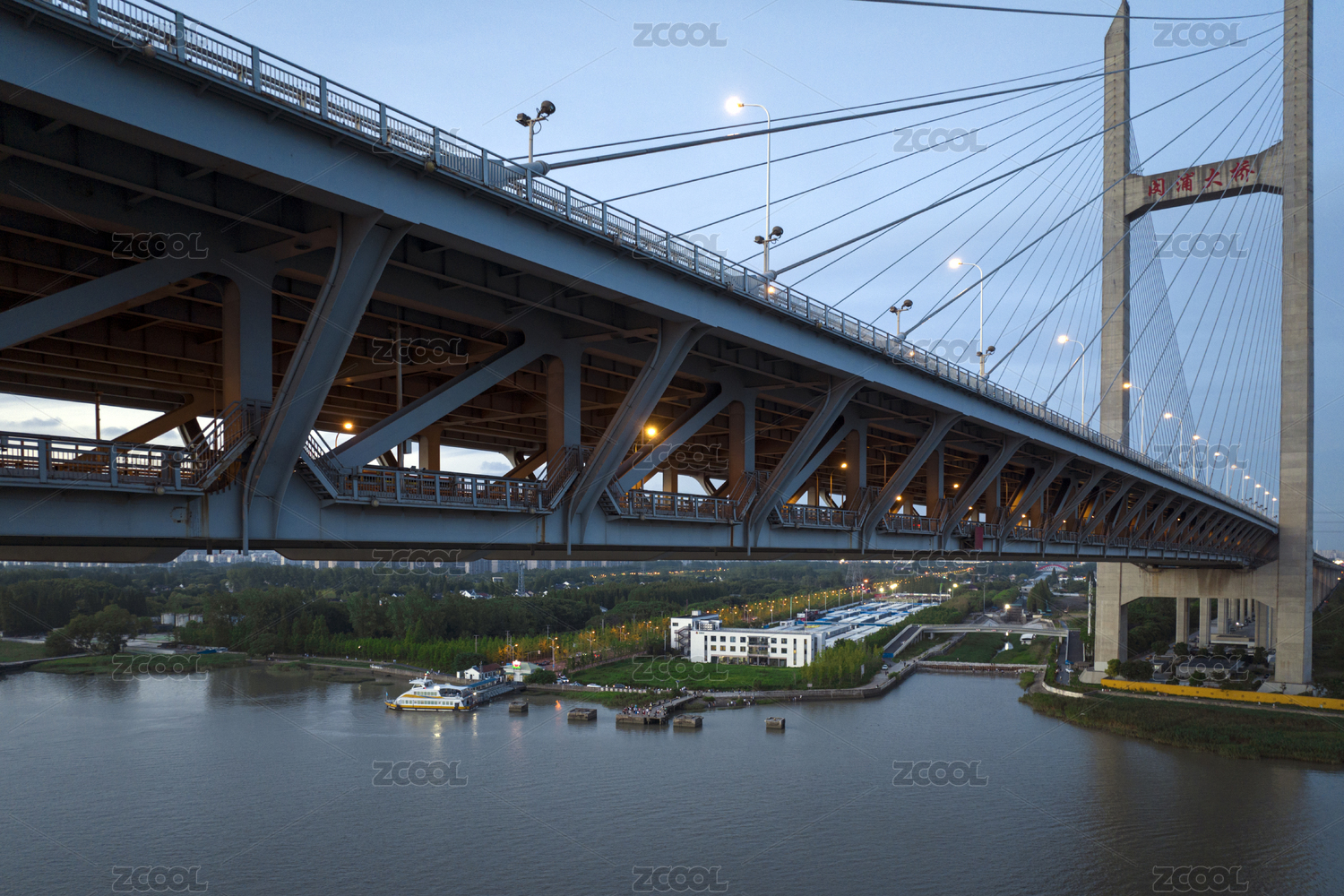 中國(guó)上海市閔浦大橋傍晚風(fēng)光
