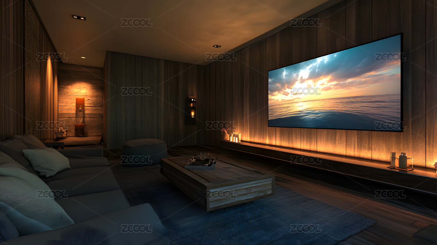 夜晚溫馨家庭影院高清電視墻
