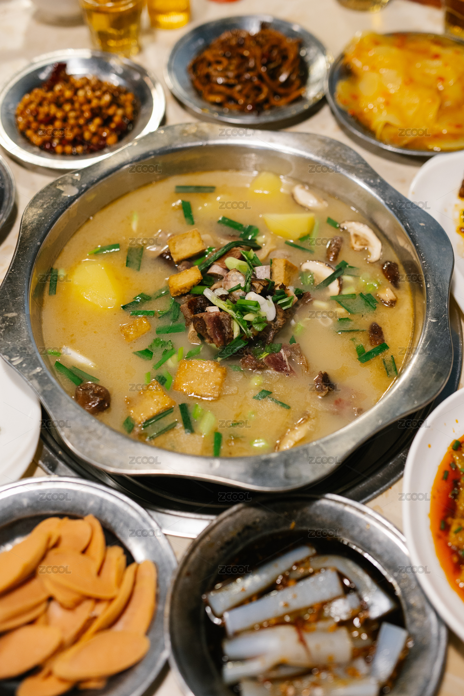 陶圓盤里的湯鍋重慶火鍋配菜干辣椒面沾排骨