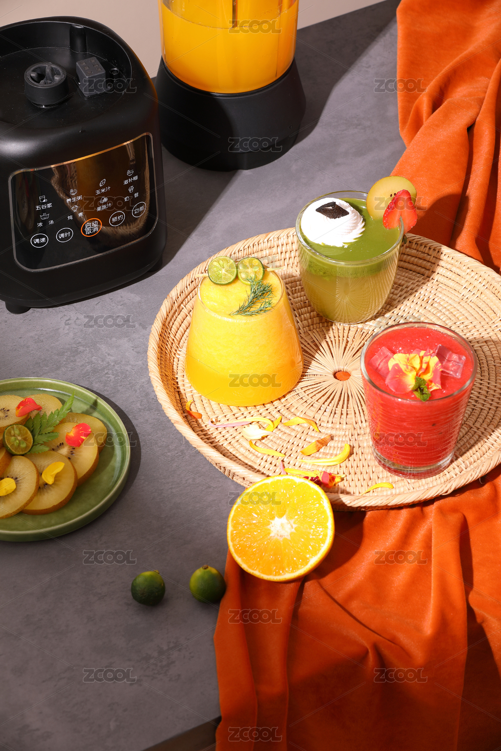 放著各種各種水果的破壁機(jī)能榨出鮮美果汁