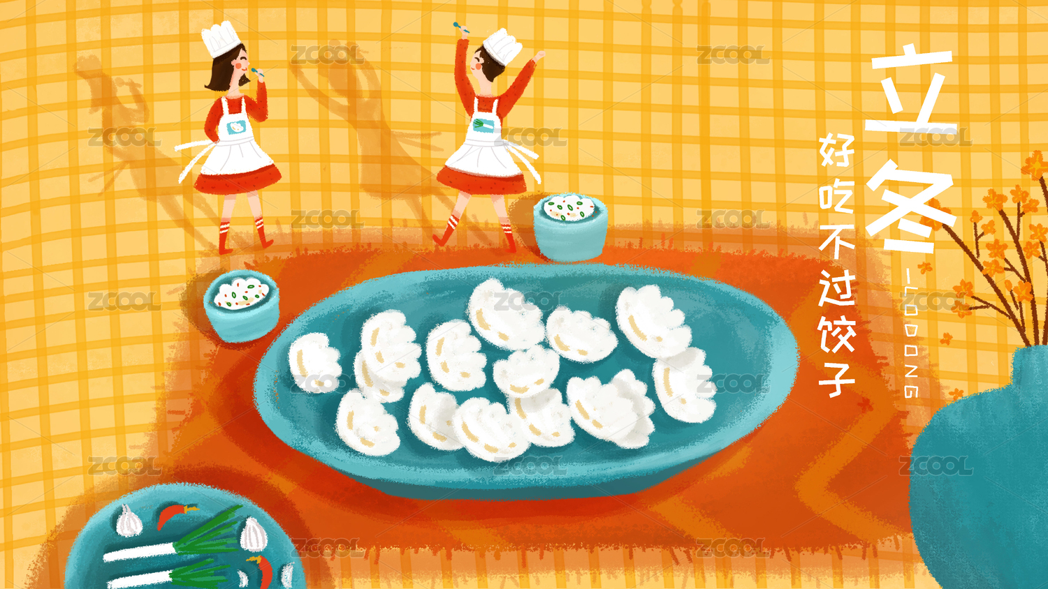立冬時(shí)節(jié)餃子和茶壺等插畫(huà)橫版