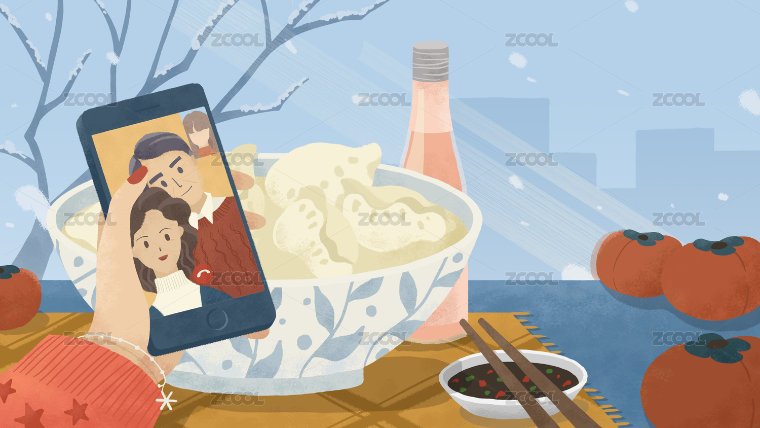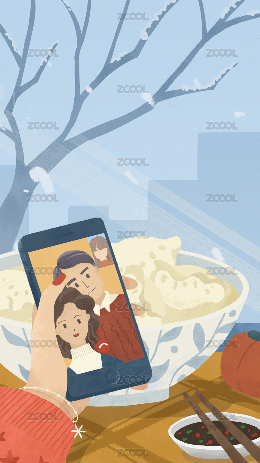 冬至和家人視頻通話吃餃子插畫(huà)