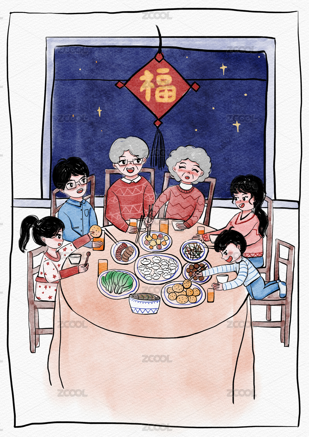 一家人團(tuán)圓年夜飯吃餃子插畫(huà)