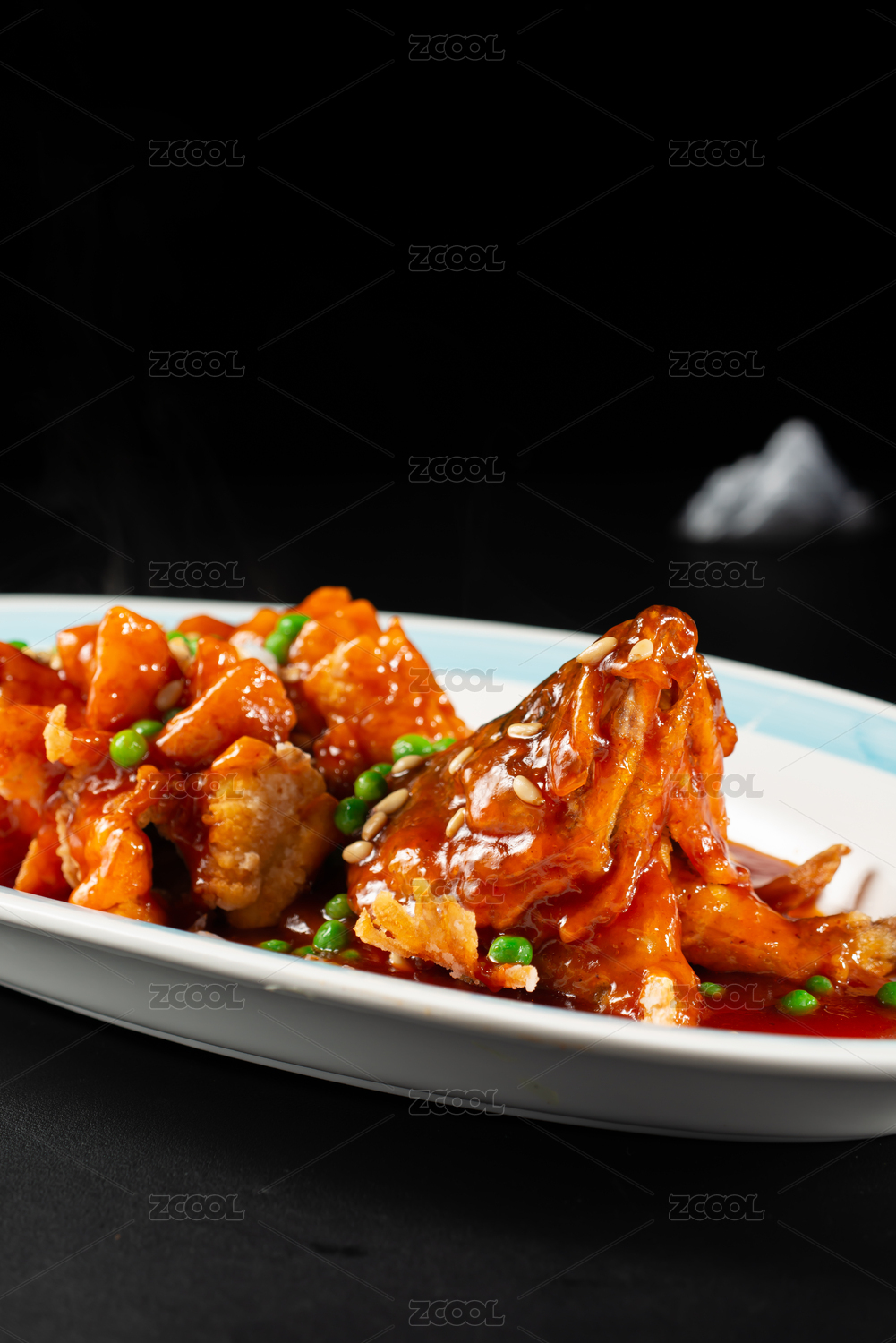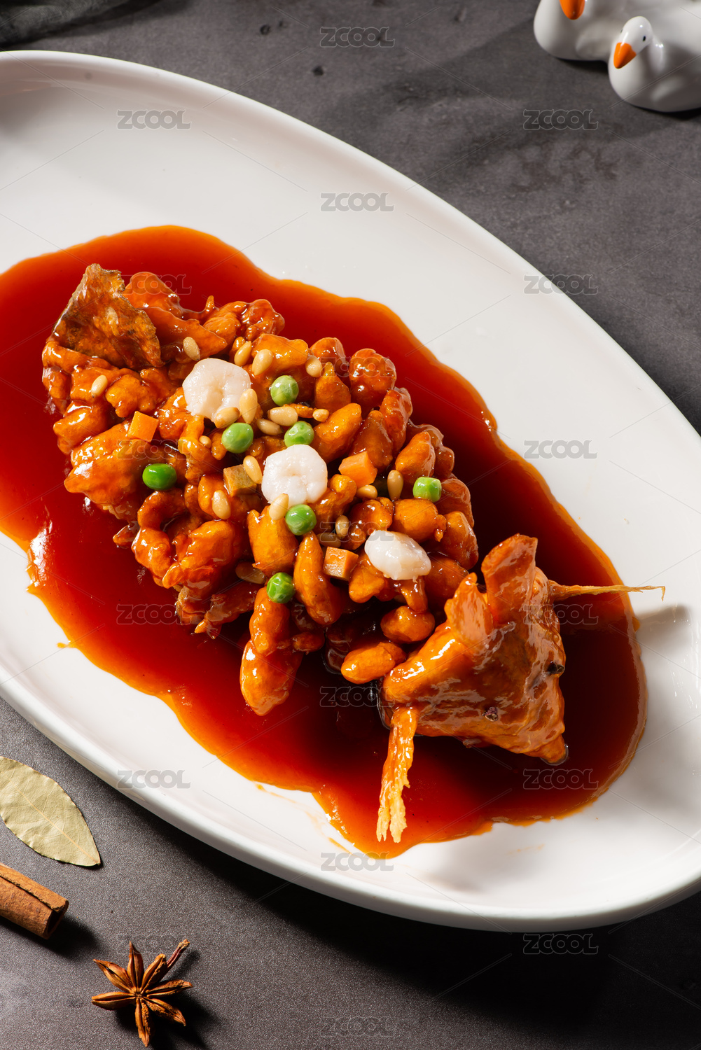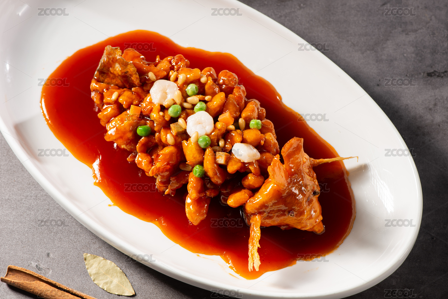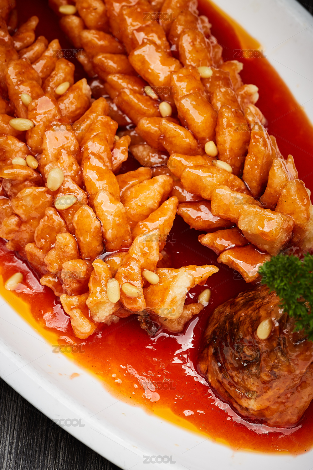 桌面上的一份松子魚食物