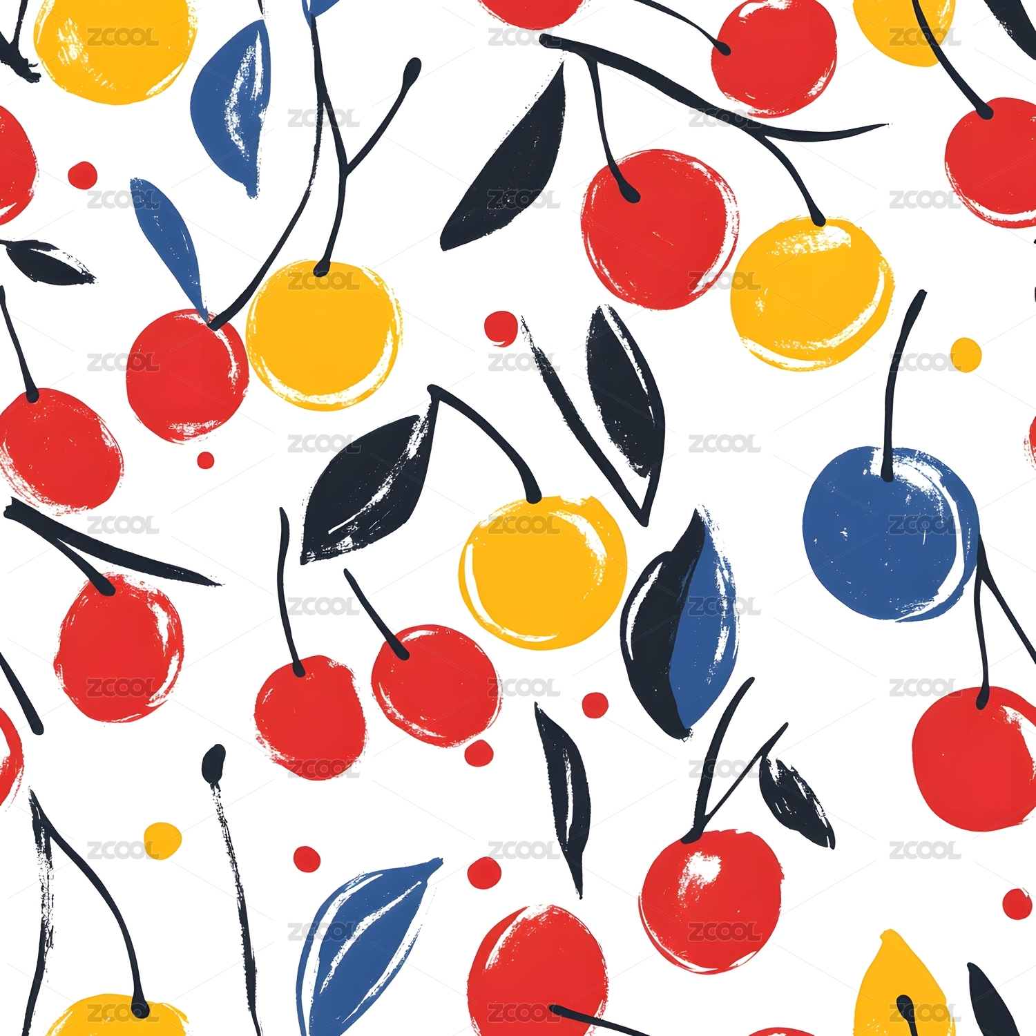 扁平畫松弛感白底櫻桃藍(lán)色葉子四方連續(xù)圖
