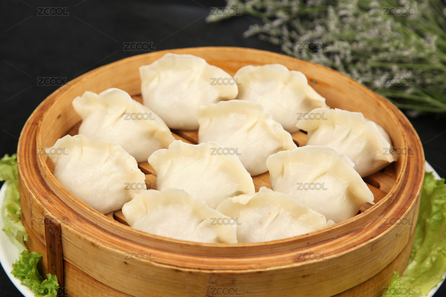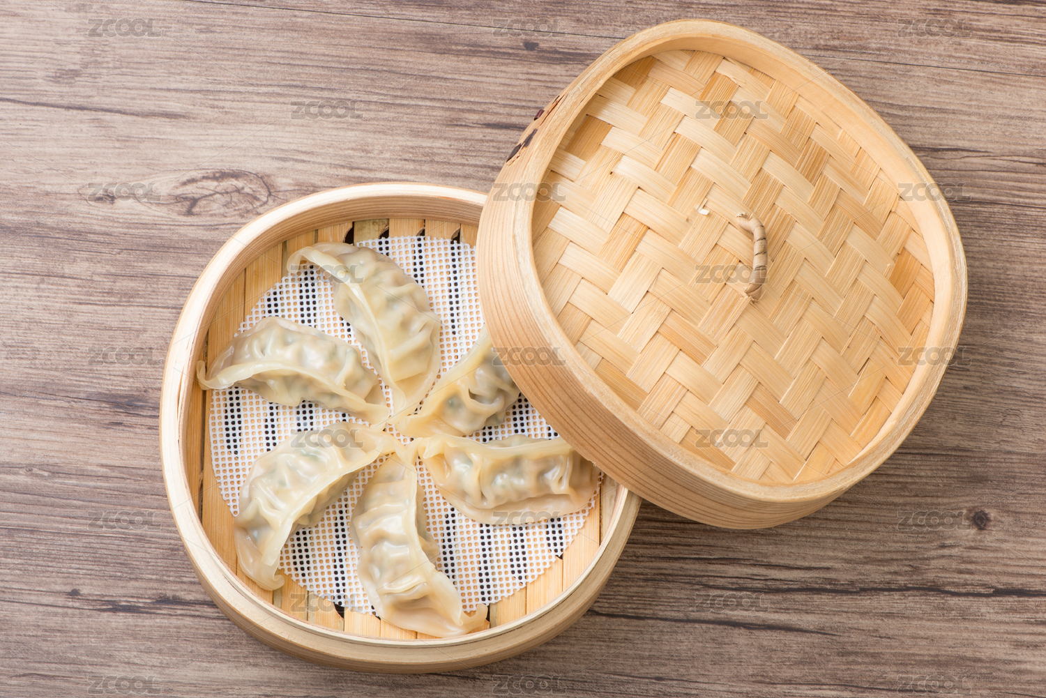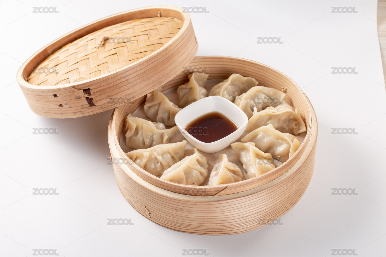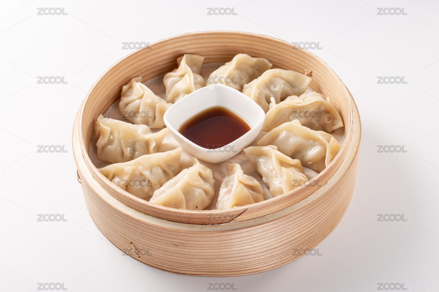 白色背景里滿滿一籠新鮮蒸餃俯視