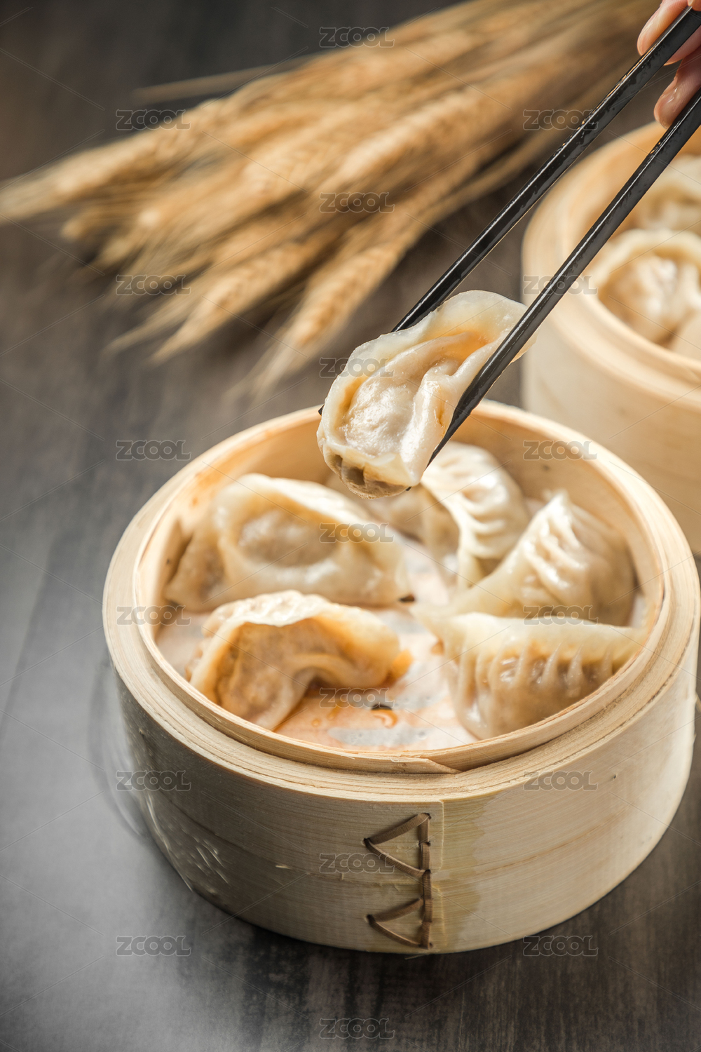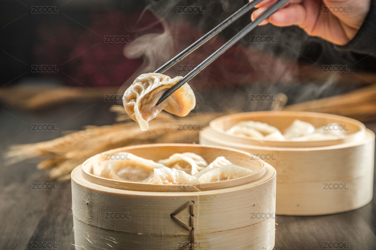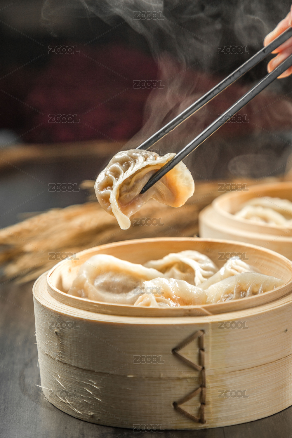 滿滿一籠蒸餃上筷子夾起的蒸餃