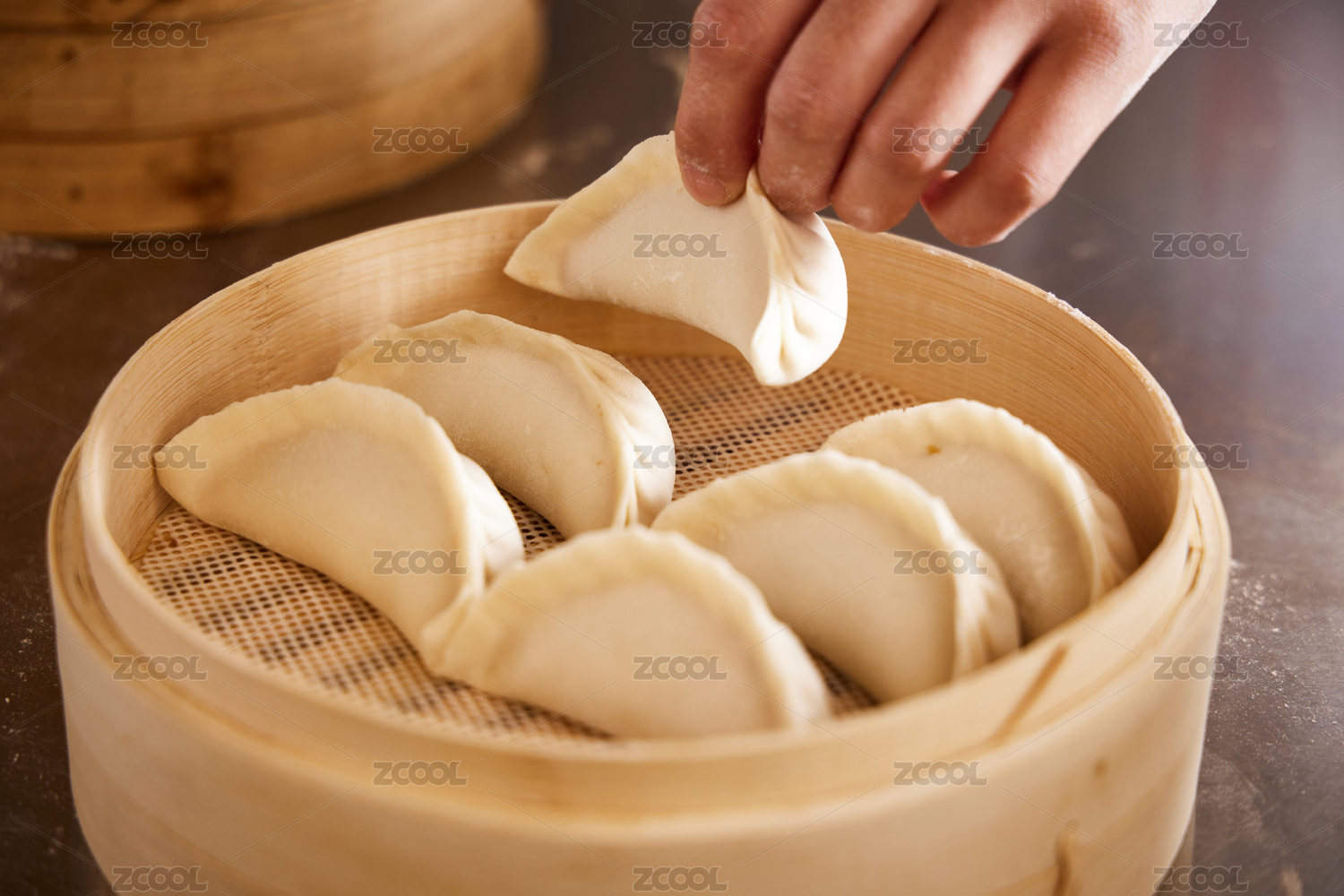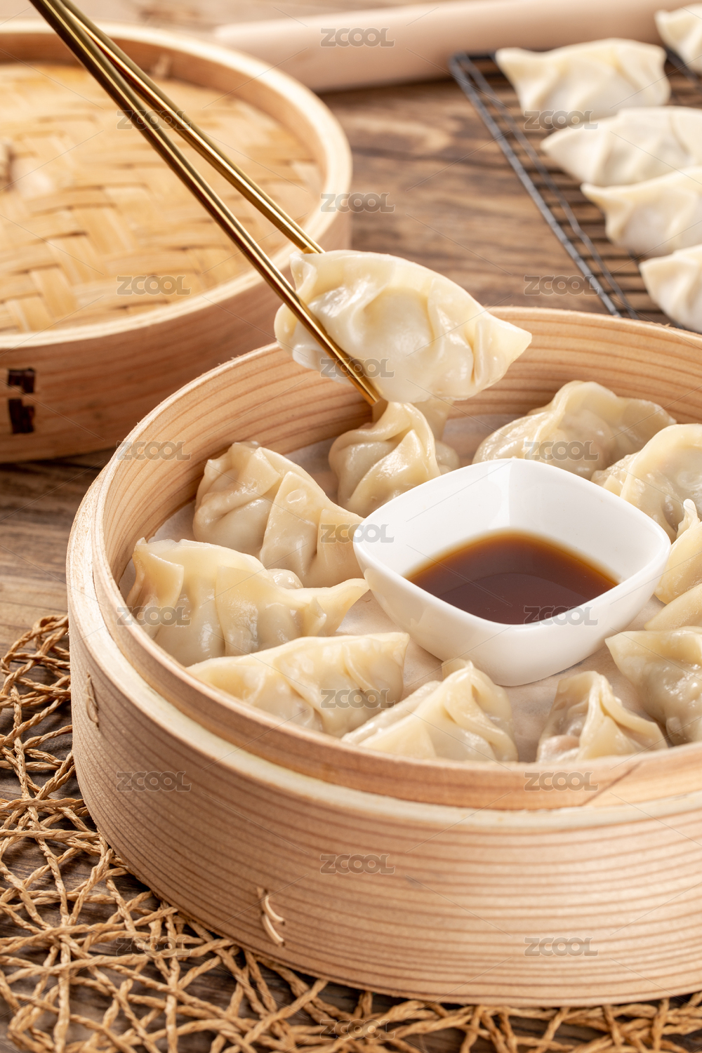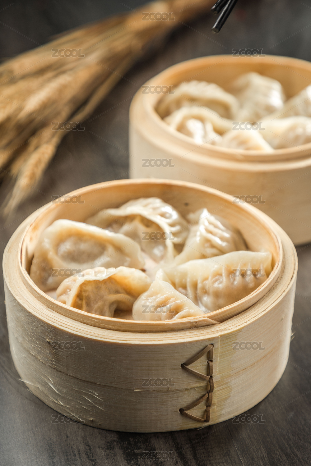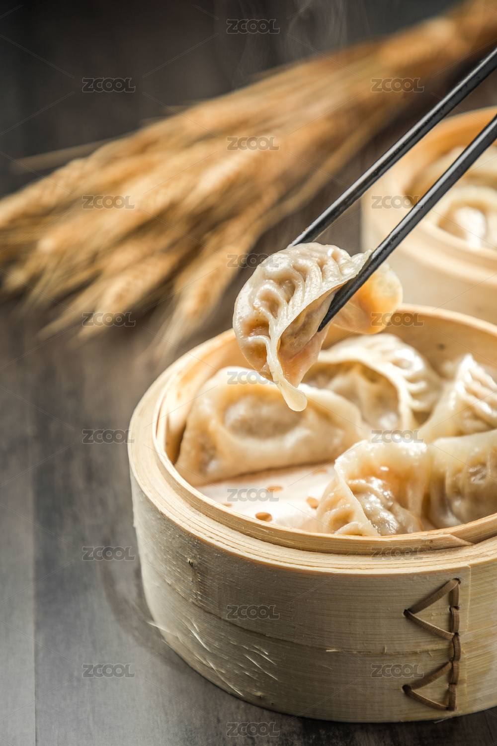 滿滿一籠蒸餃上筷子夾起的蒸餃