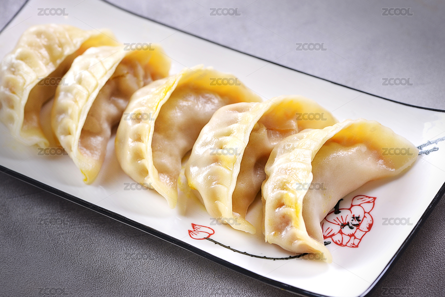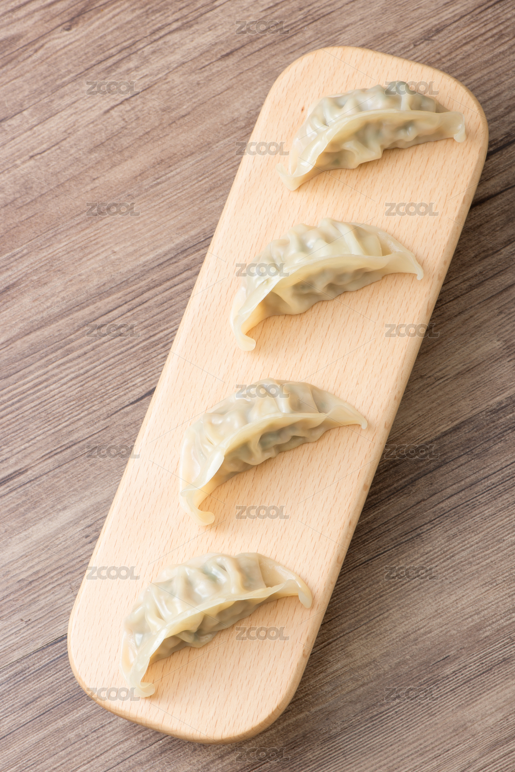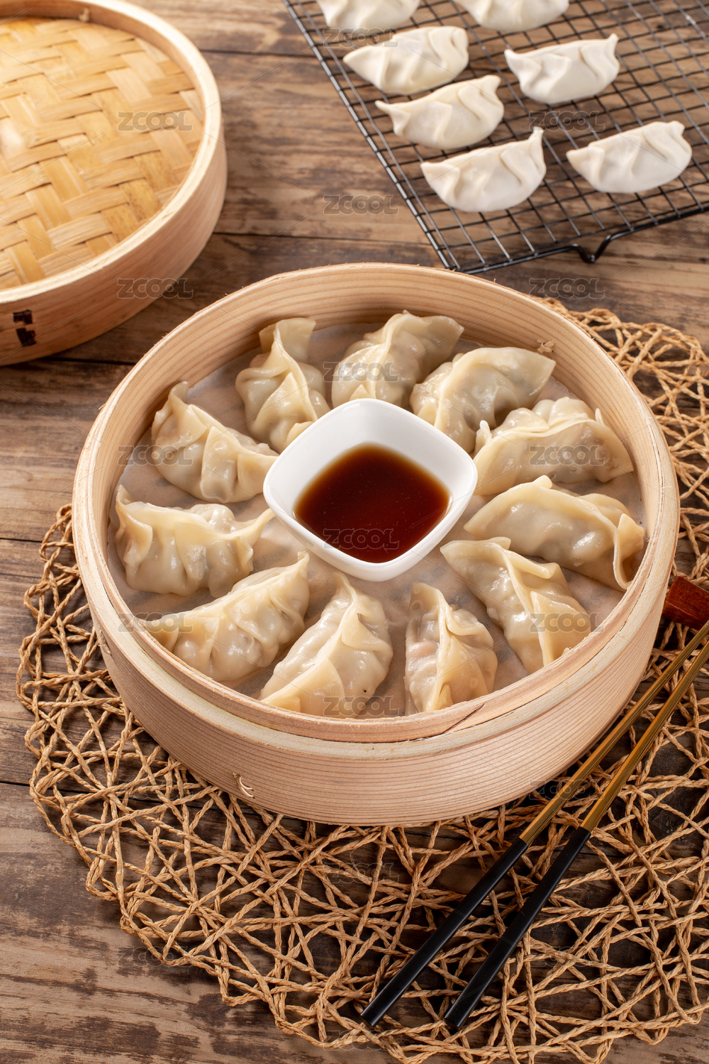 棕色木紋桌面上放著一份冒著熱氣的蒸餃