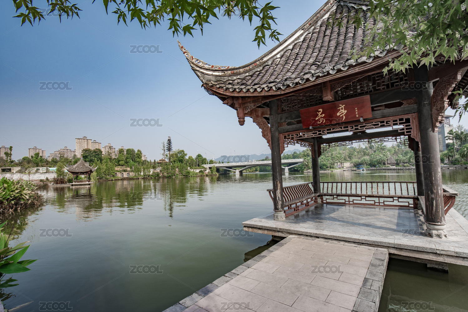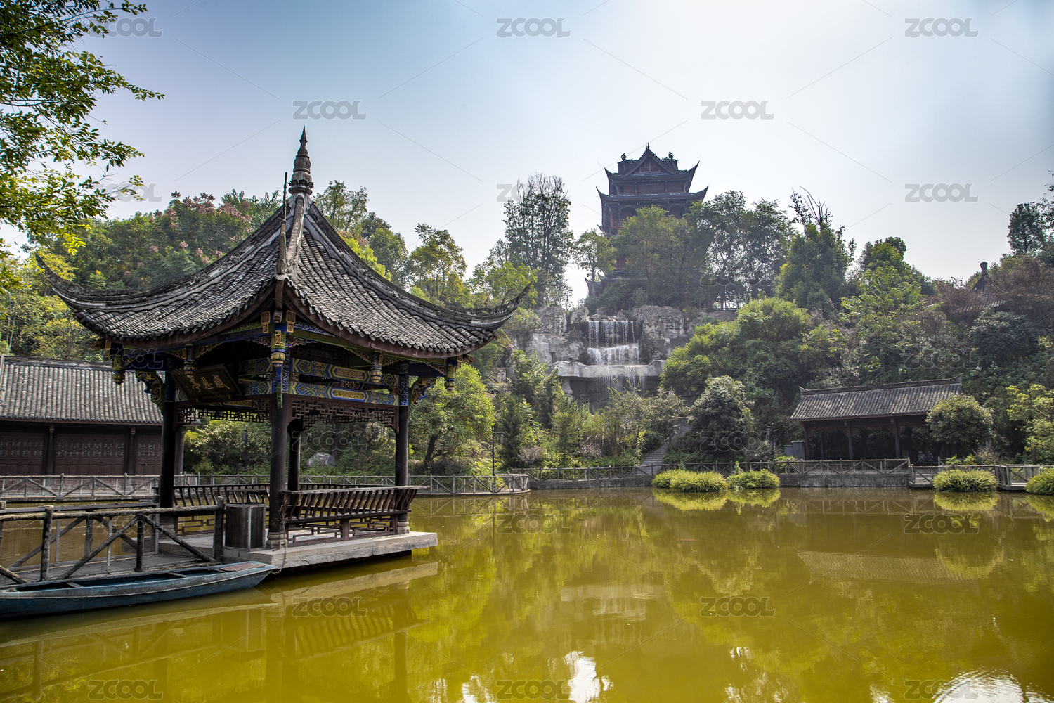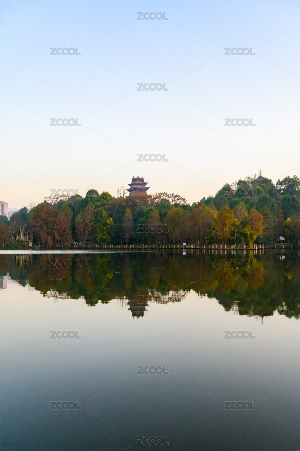 四川峨眉山市秀湖陰雨天湖中的亭子
