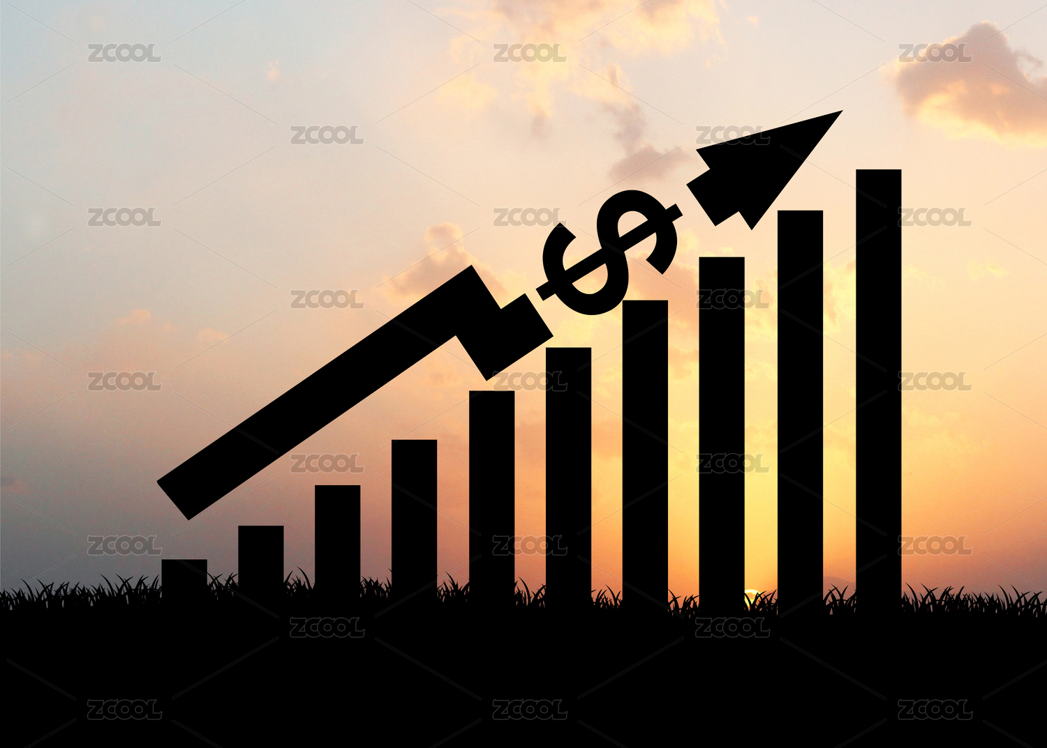日落背景前的剪影草地上遞增的條形圖及輔助的上漲箭頭和美元符號