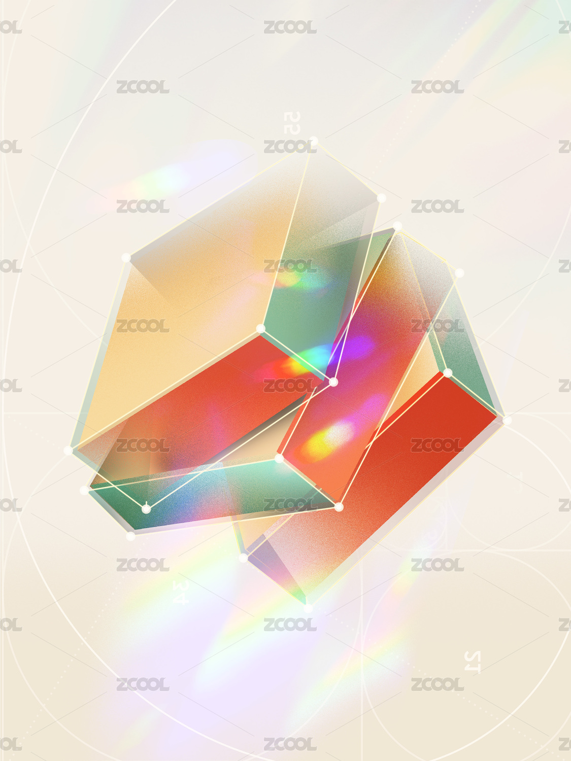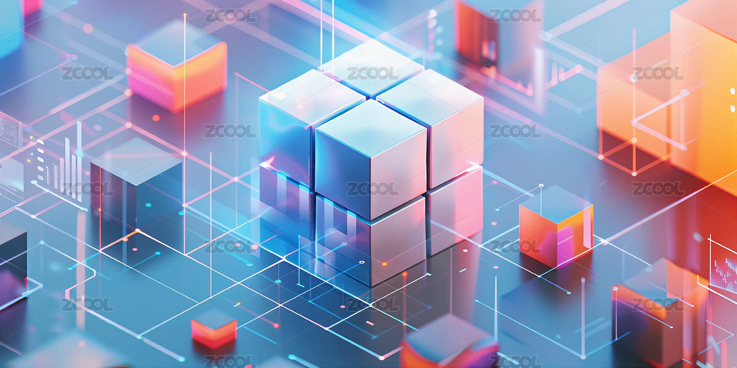 藍底晶瑩透亮熒光色立方體魔方3D立體插畫