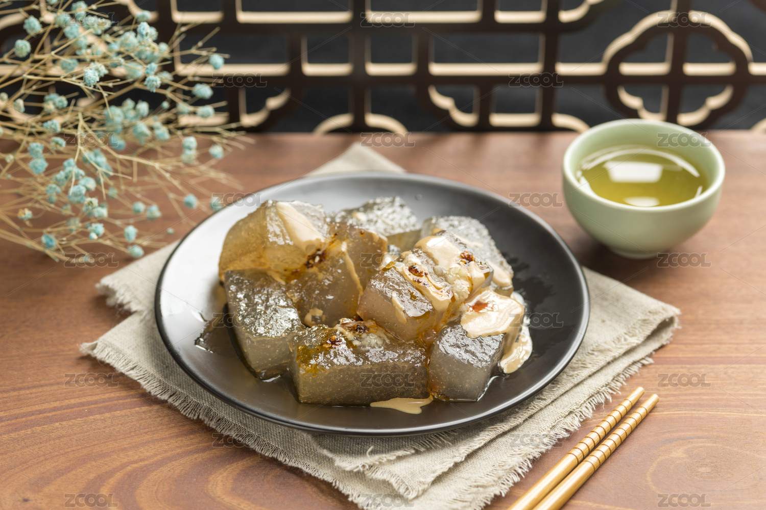 天津傳統(tǒng)小吃煎燜子特寫木桌面深色調(diào)