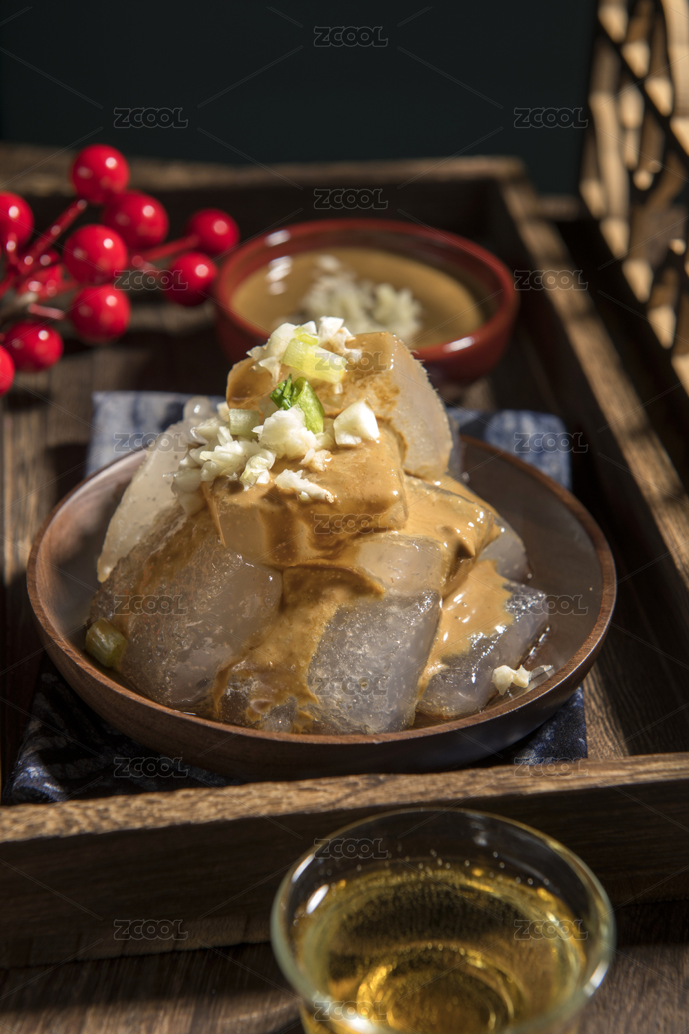 天津小吃燜子特寫木桌面深色調(diào)