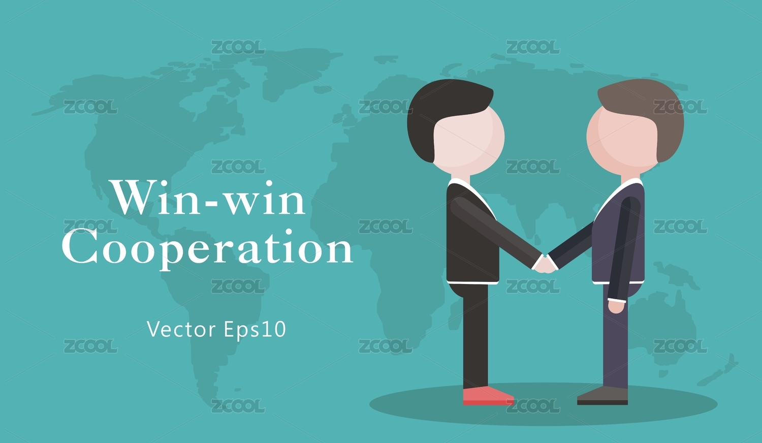 兩商人愉快握手,合作共贏團(tuán)隊(duì)概念,世界地圖背景,矢量設(shè)計(jì)