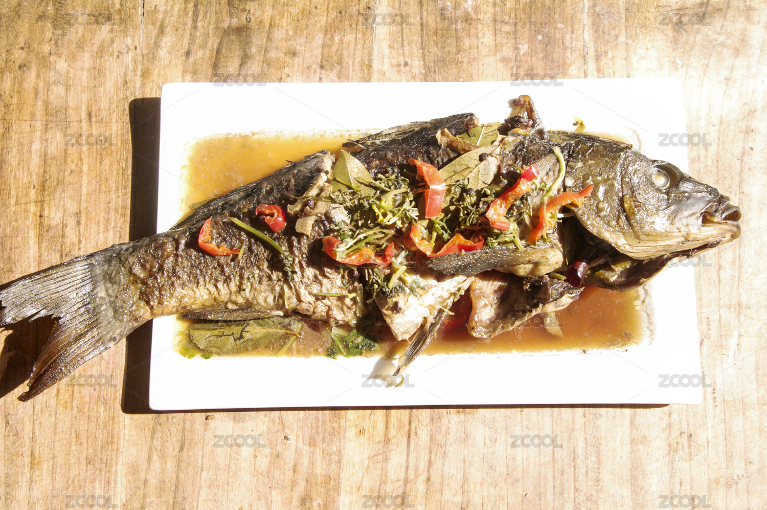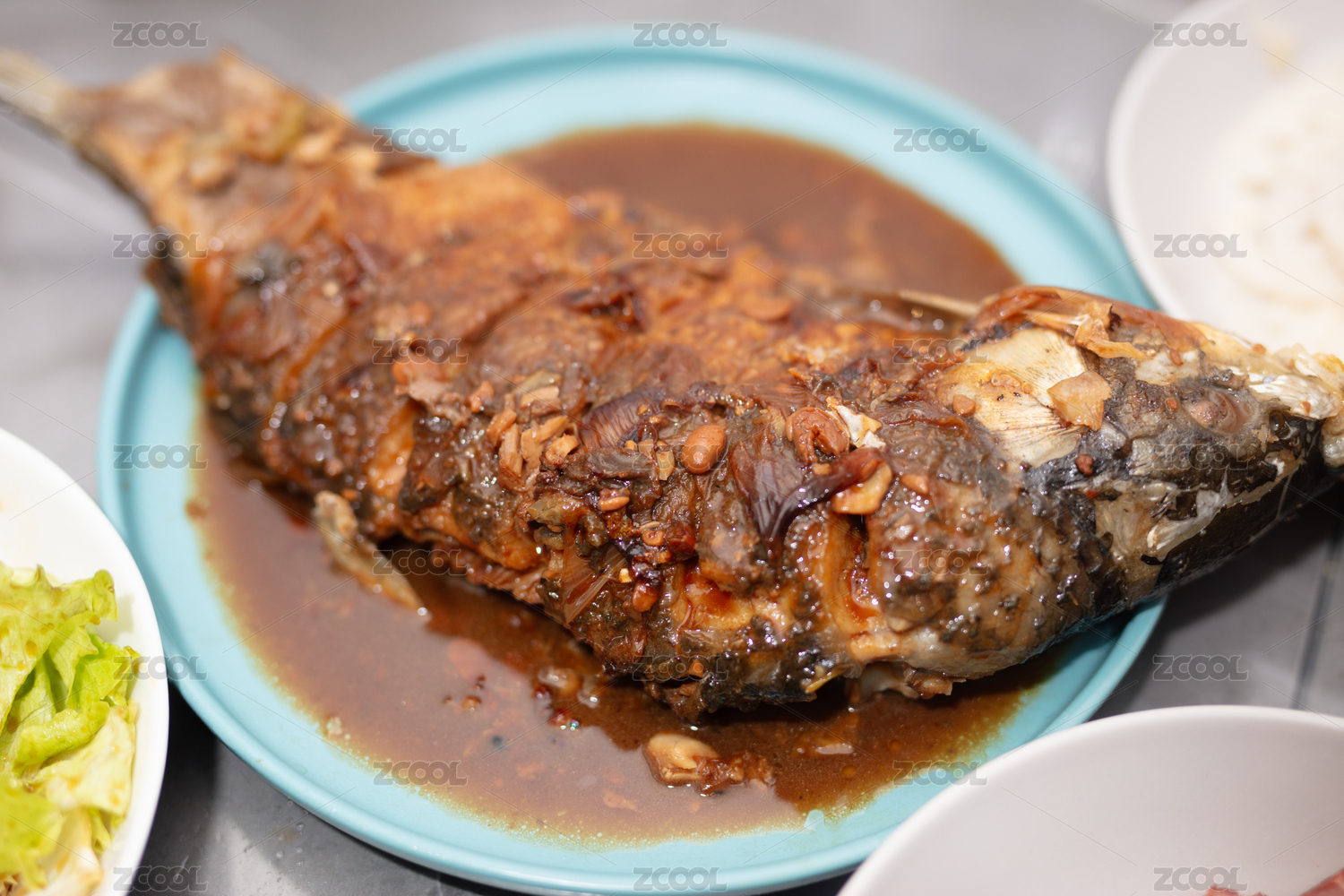 一盤紅燒鯉魚和其它配菜