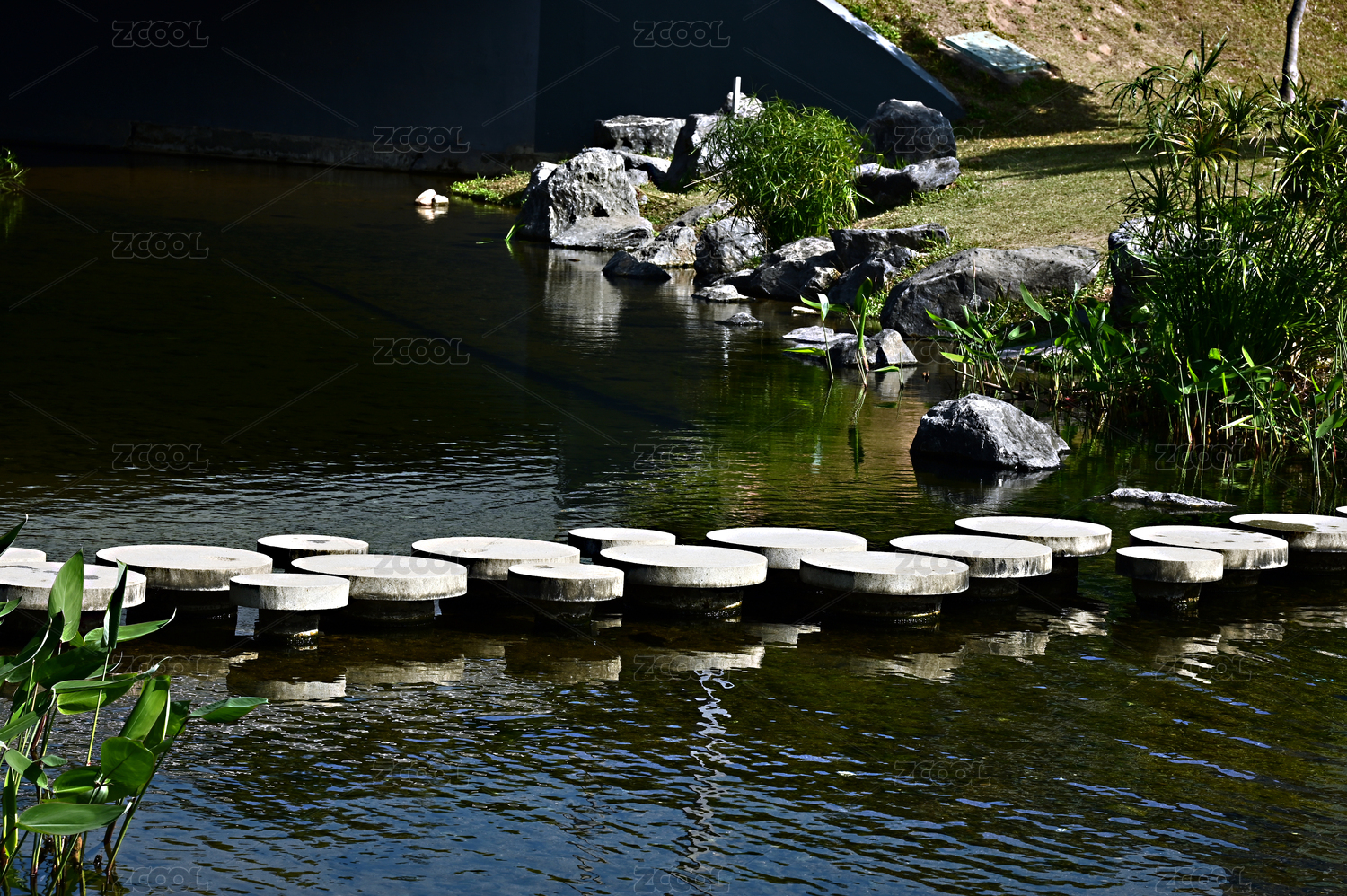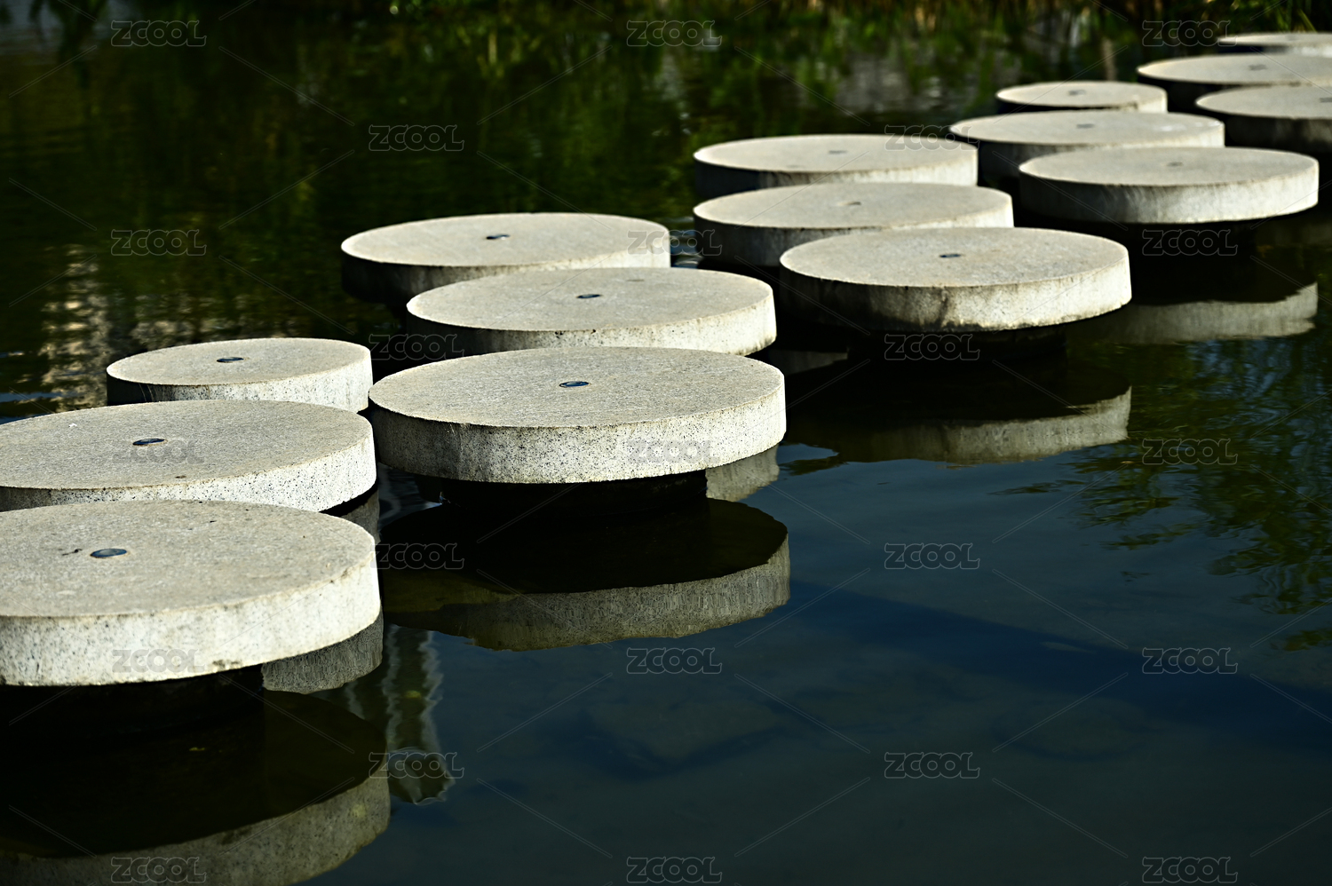 光影下平靜水面上的圓形石板路倒影