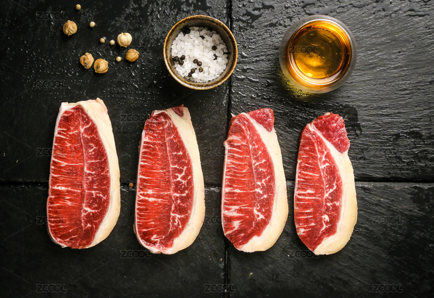 黑色石板上的精品牛肉和和調(diào)味品