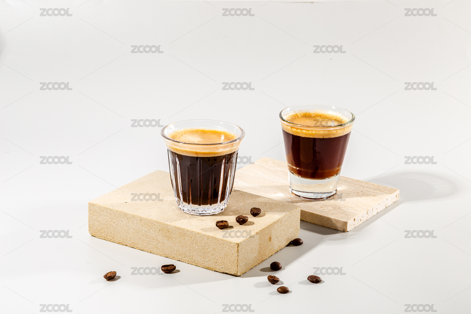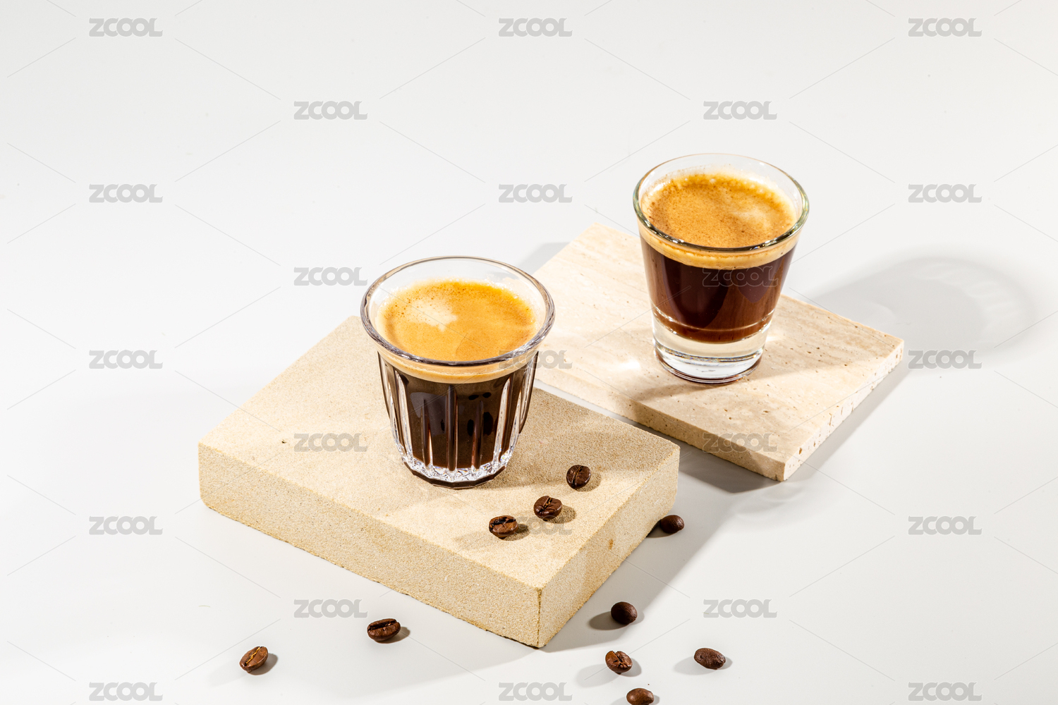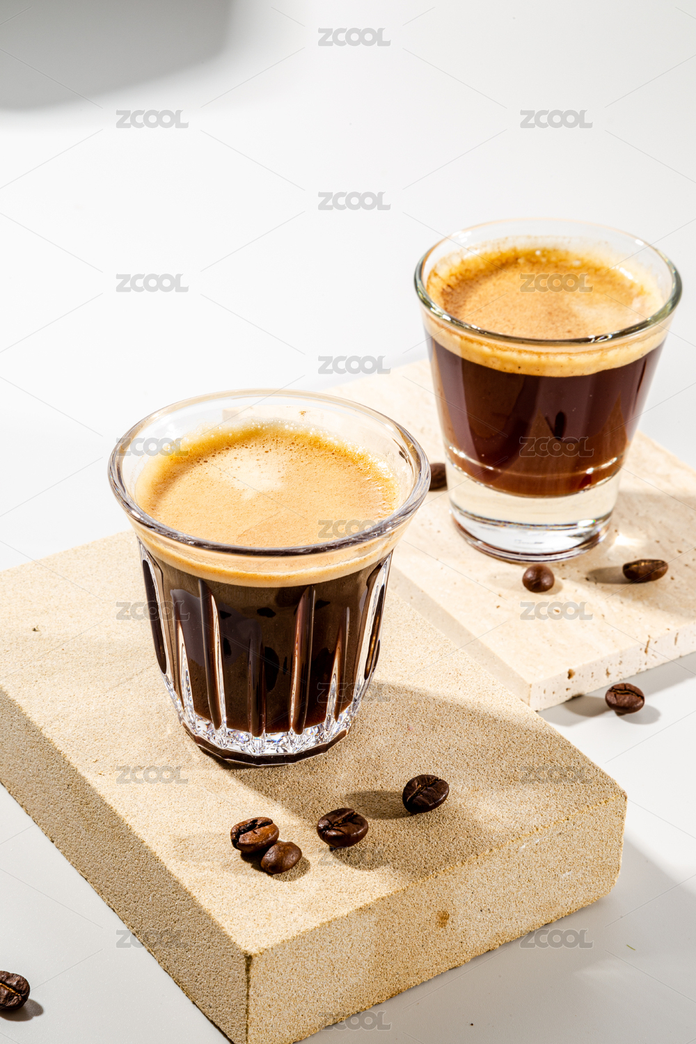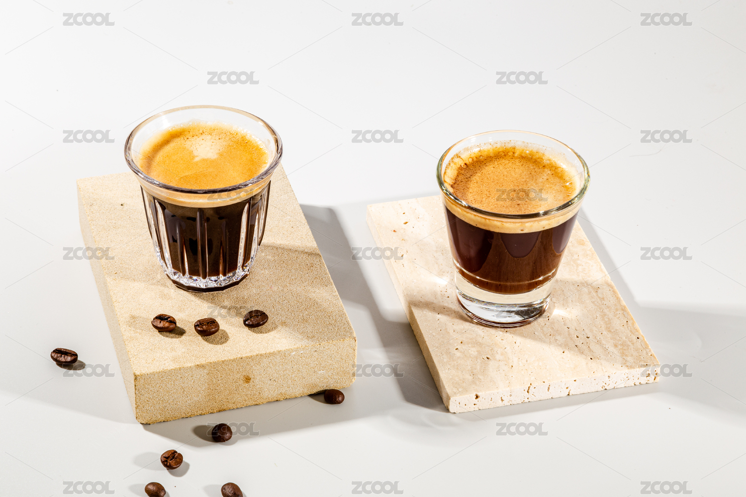 石板上有兩杯濃縮咖啡和一些咖啡豆