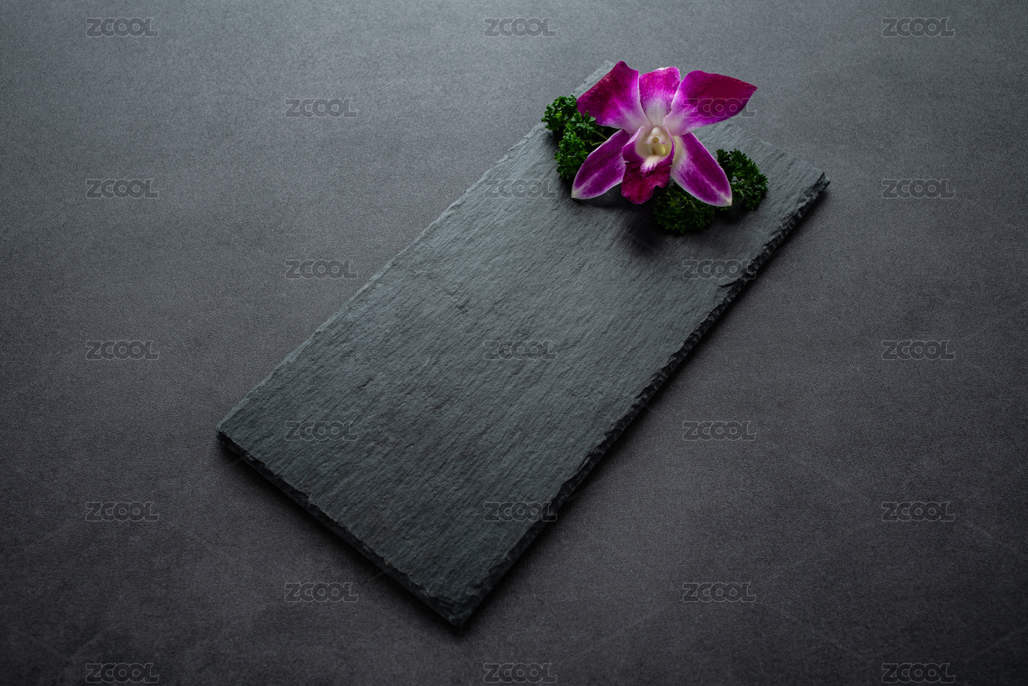 蘭花歐芹擺盤裝飾的黑色石板托盤