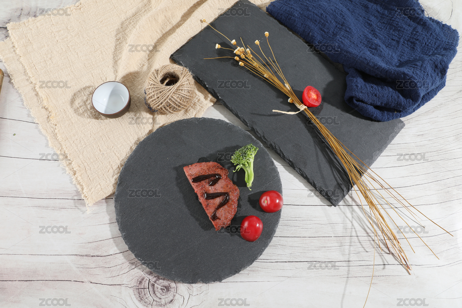 黑色的石板上面放上各種菜品
