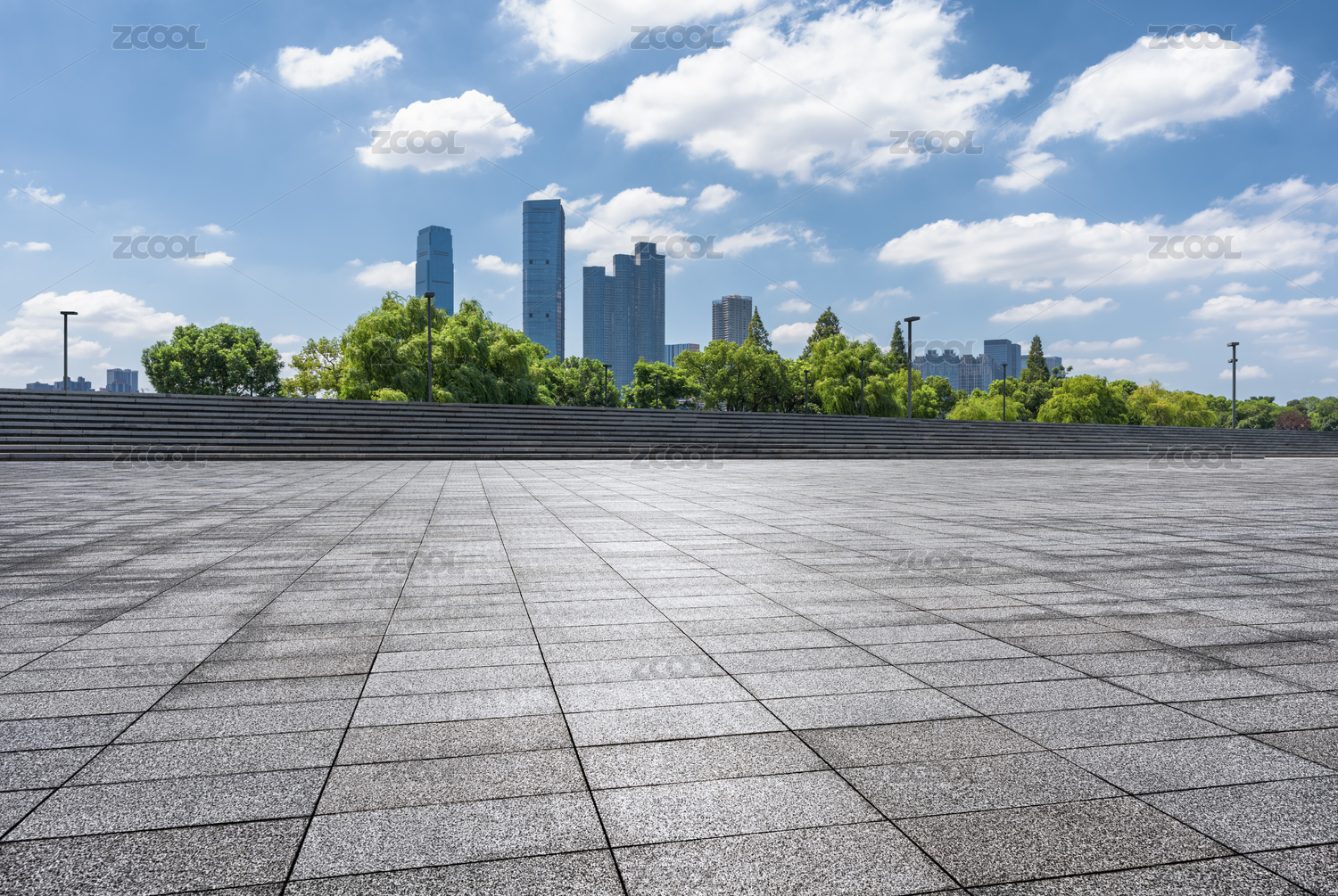 藍(lán)天白云下的城市廣場(chǎng)和花崗巖石磚地面