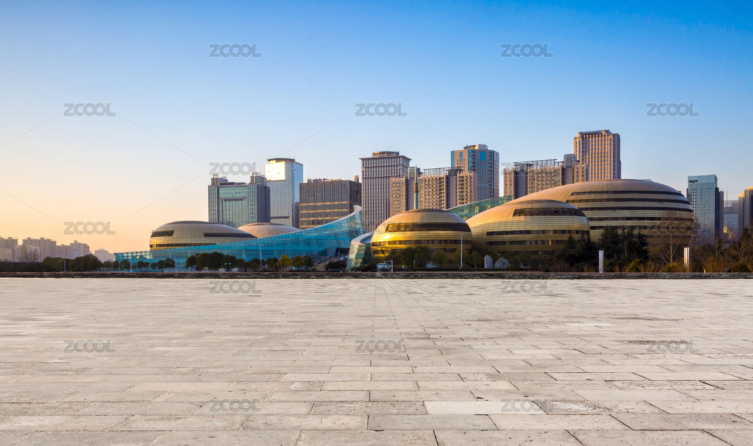 黃昏時(shí)分,前景為石磚道路的鄭州城市景觀和城市天際線