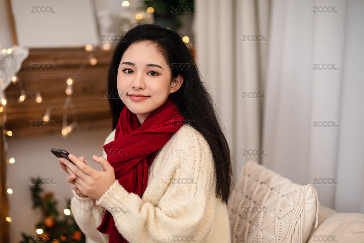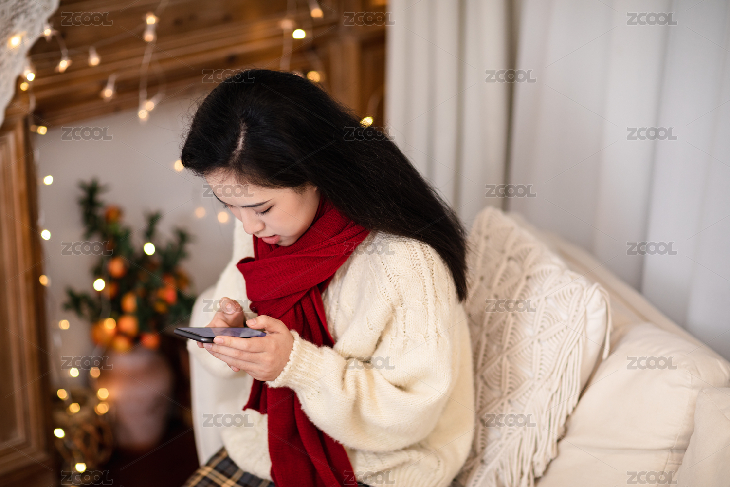 圍著紅色圍巾的長(zhǎng)發(fā)美女低頭看手機(jī)