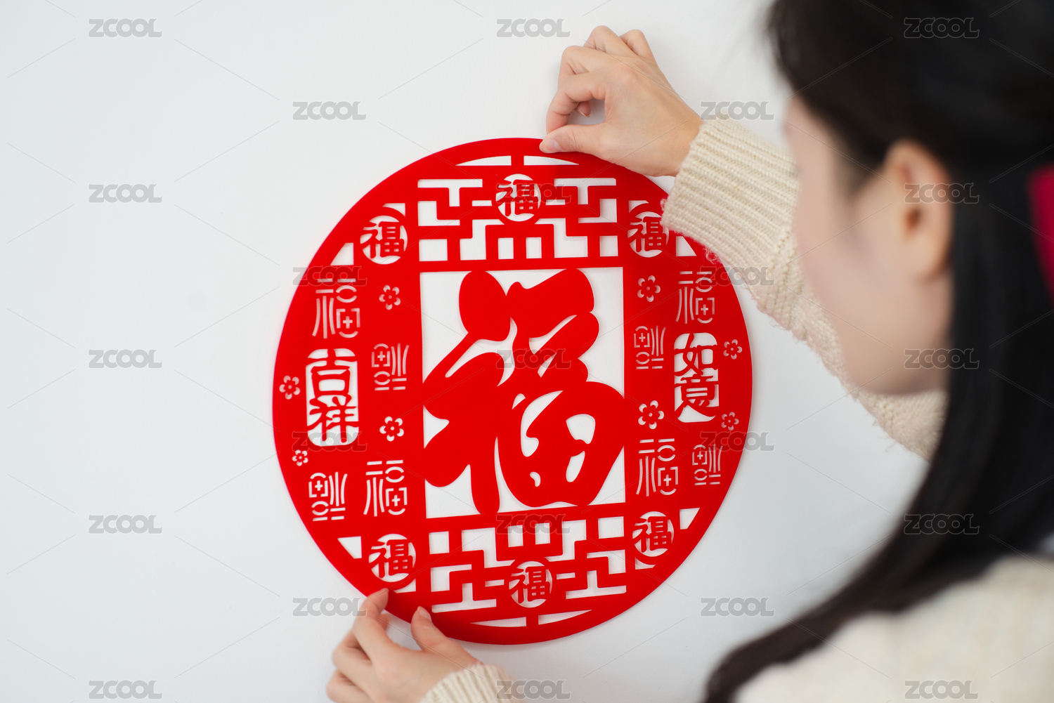一個(gè)女人在往白墻上貼過(guò)年福字裝飾家居