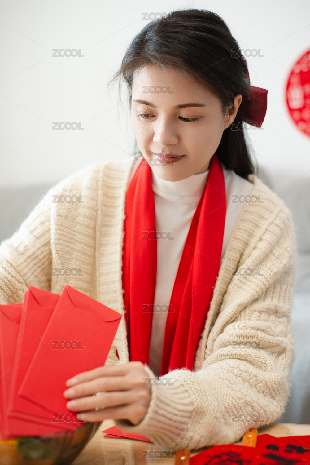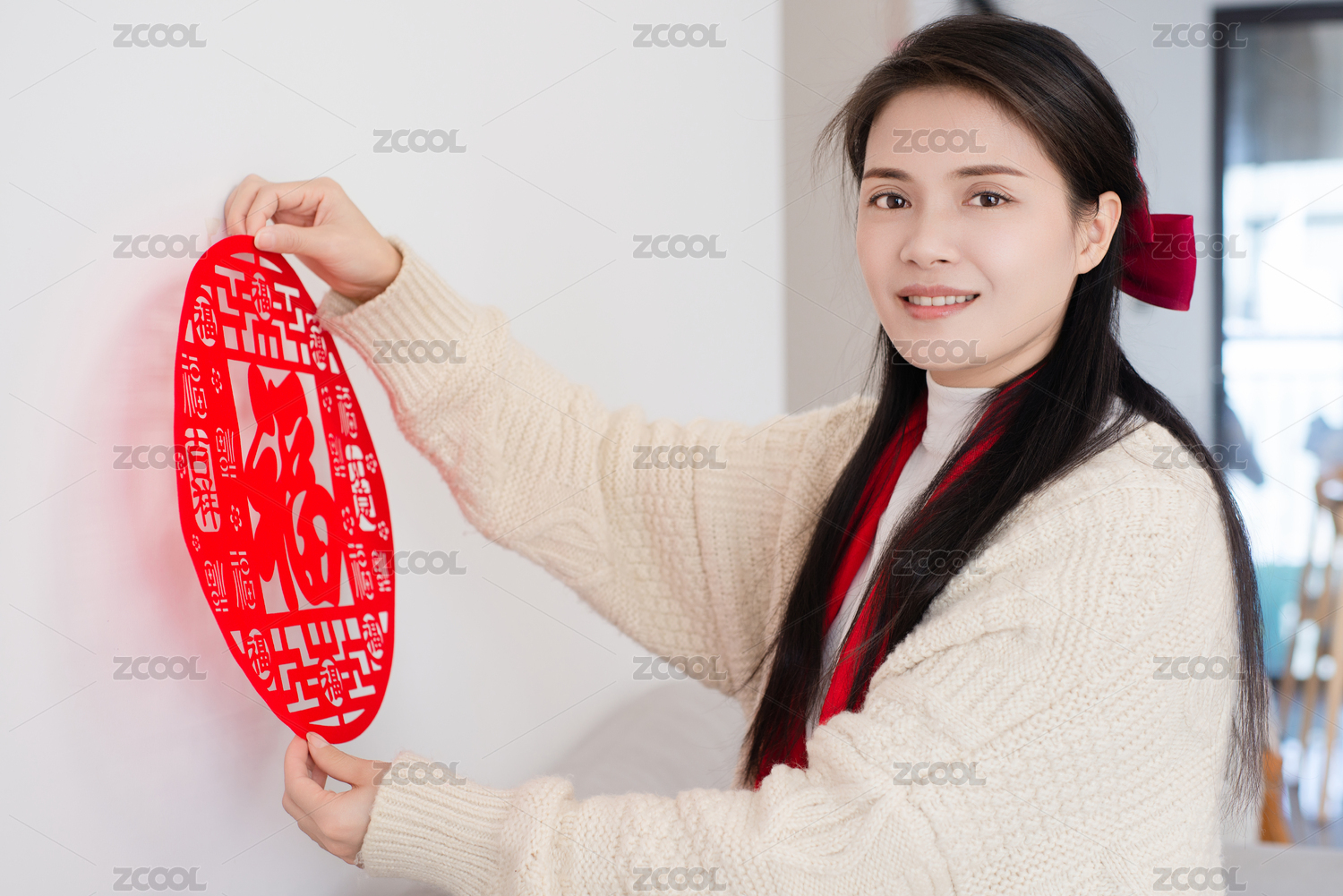 一個(gè)年輕女人在貼紅色福字飾品