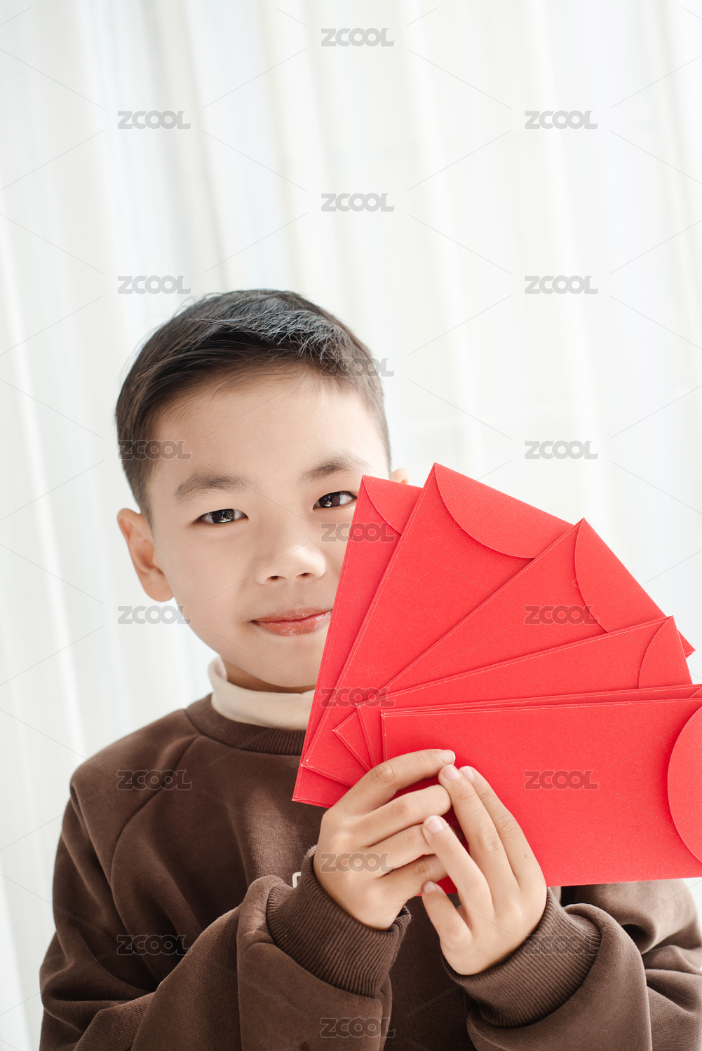 一個(gè)中國(guó)小男孩開心地拿著一疊紅包展示