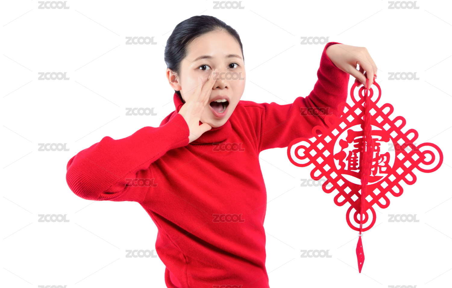 一個(gè)女人拿著紅色春節(jié)福字剪紙