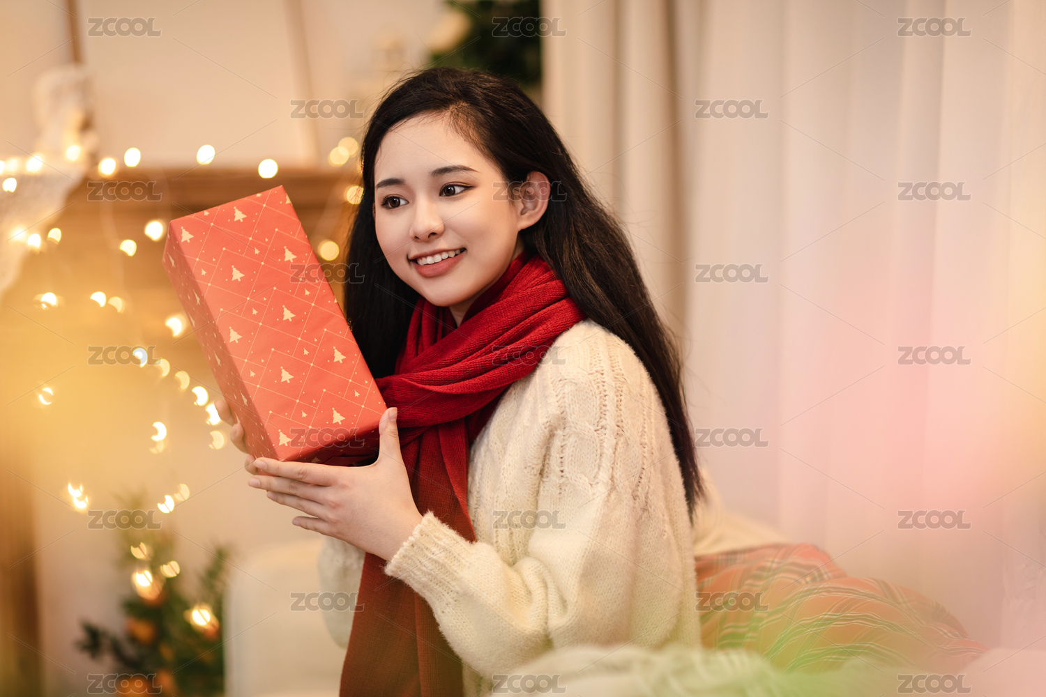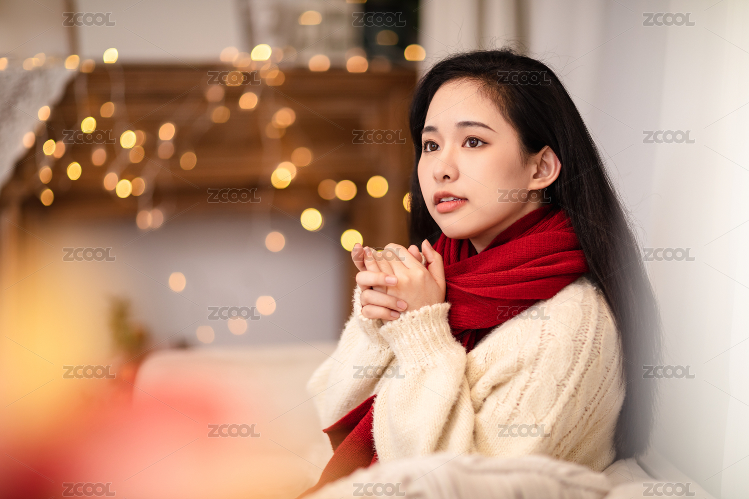 冬日圍著紅色圍巾穿著白色毛衣的溫暖女孩