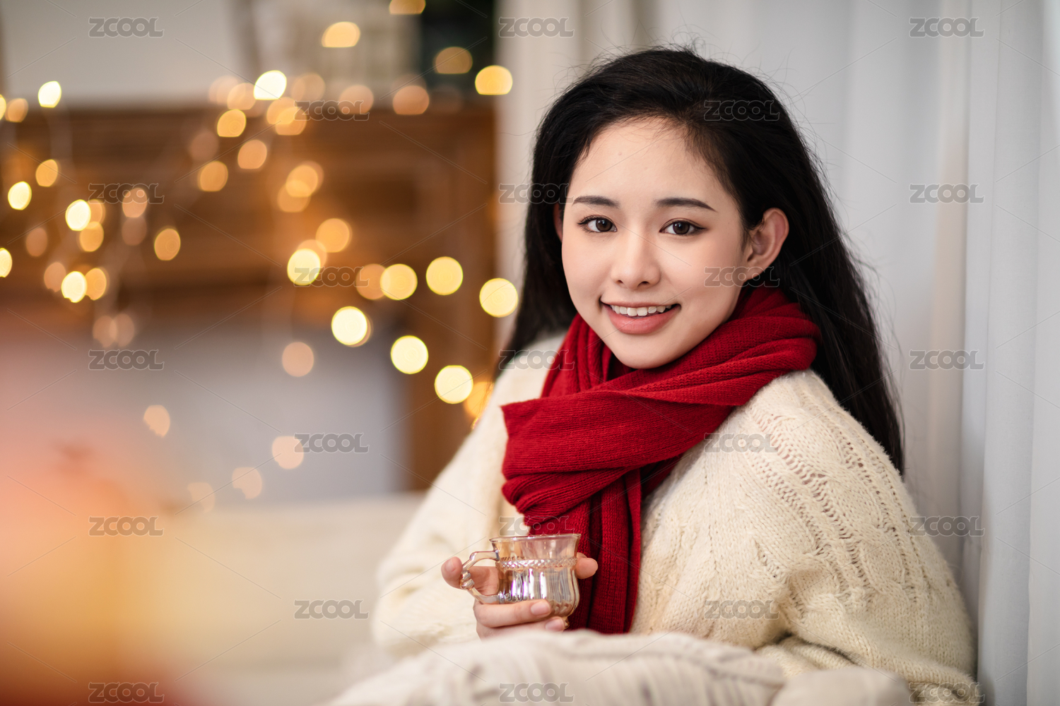 冬天坐在客廳雙手捧杯子的甜美女孩
