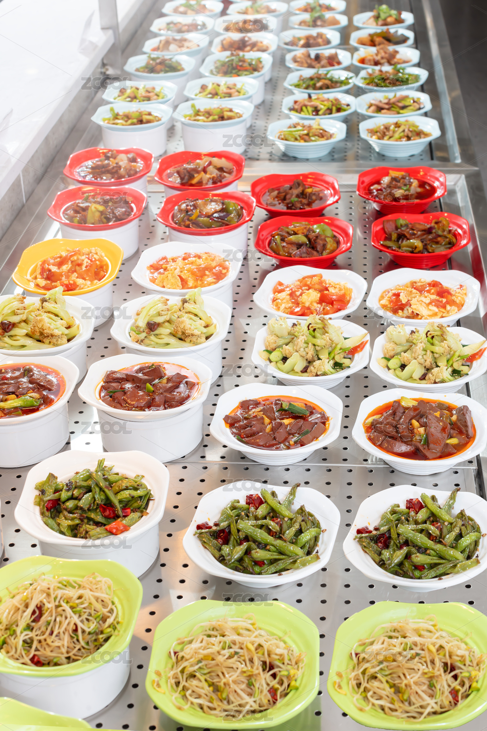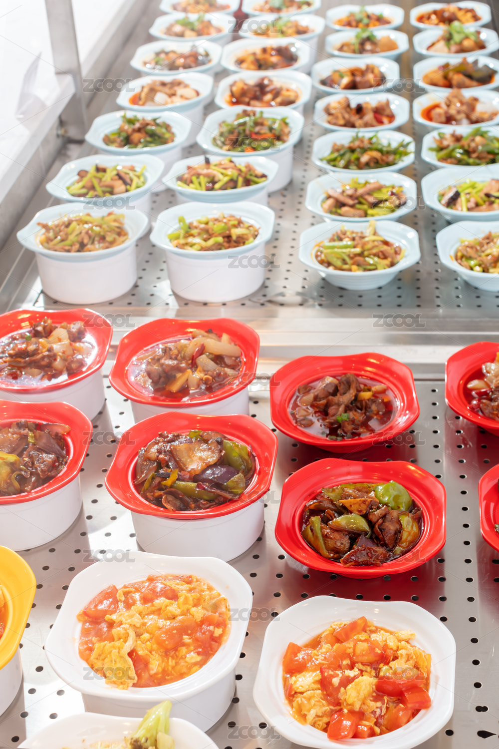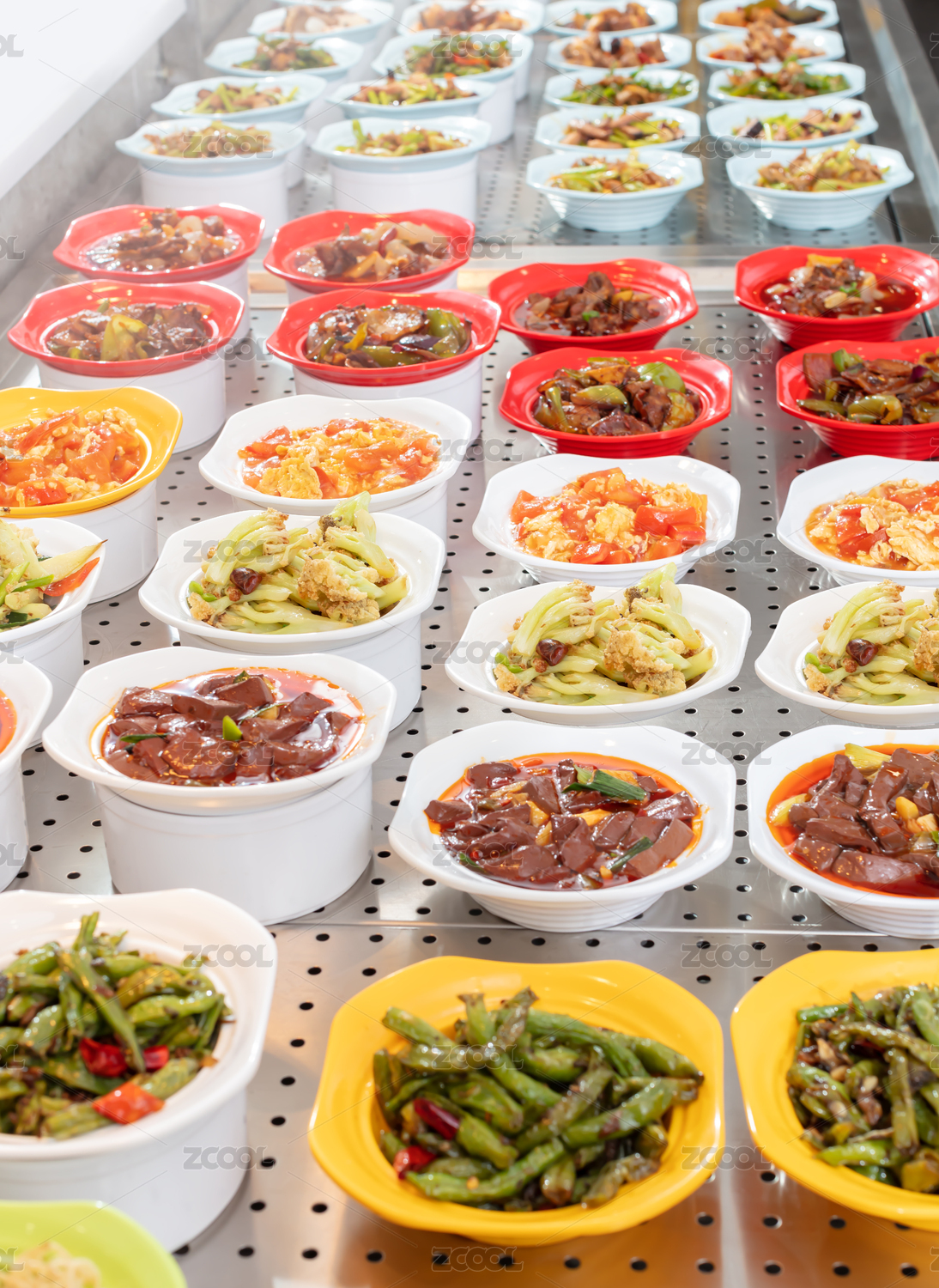 蒸氣熱點(diǎn)餐臺(tái)上的自助餐各種菜品小碗菜