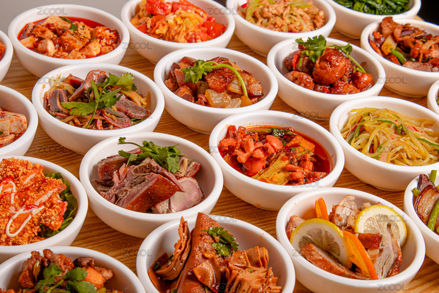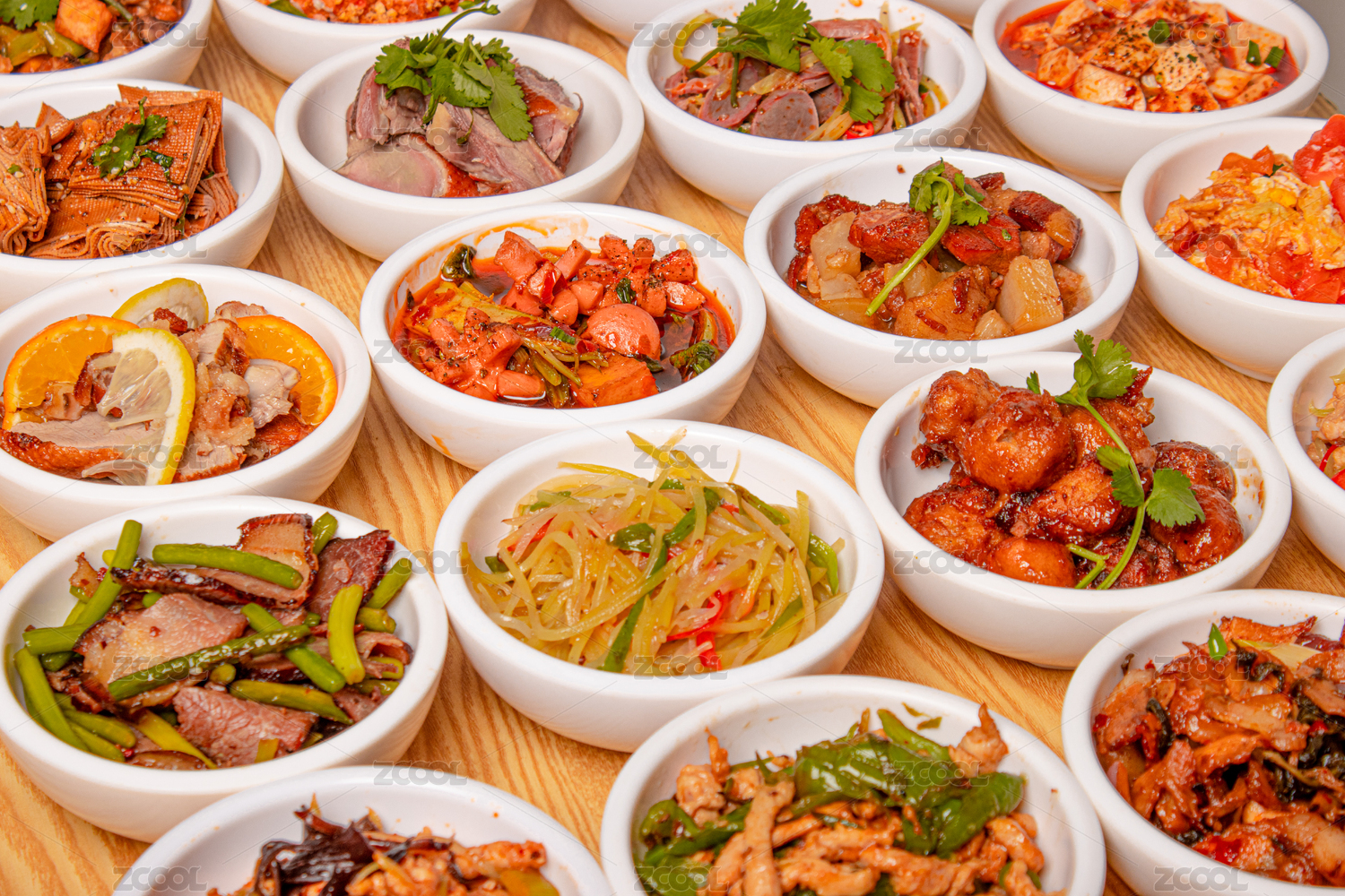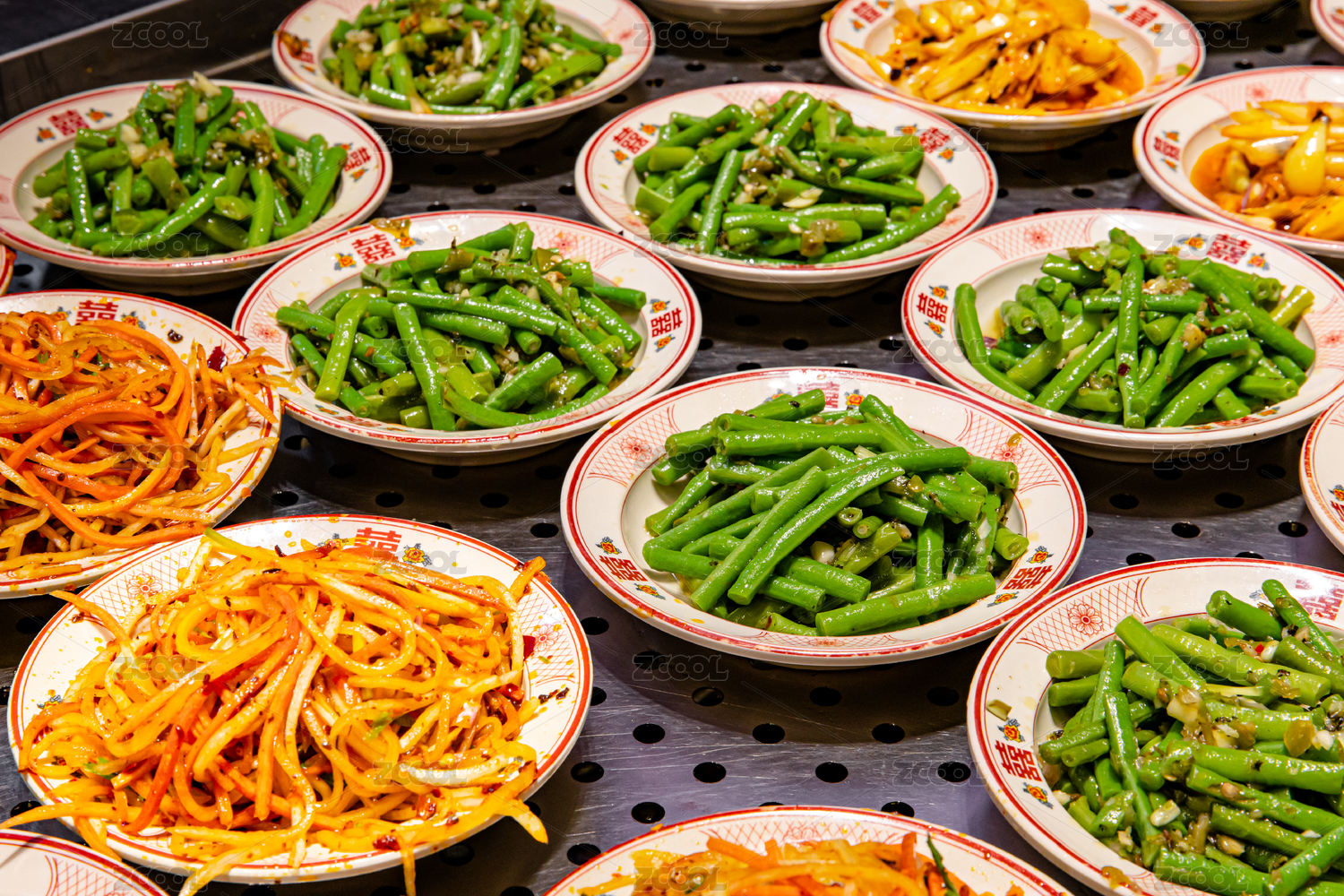 蒸氣熱點(diǎn)餐臺(tái)上的自助餐各種菜品小碗菜