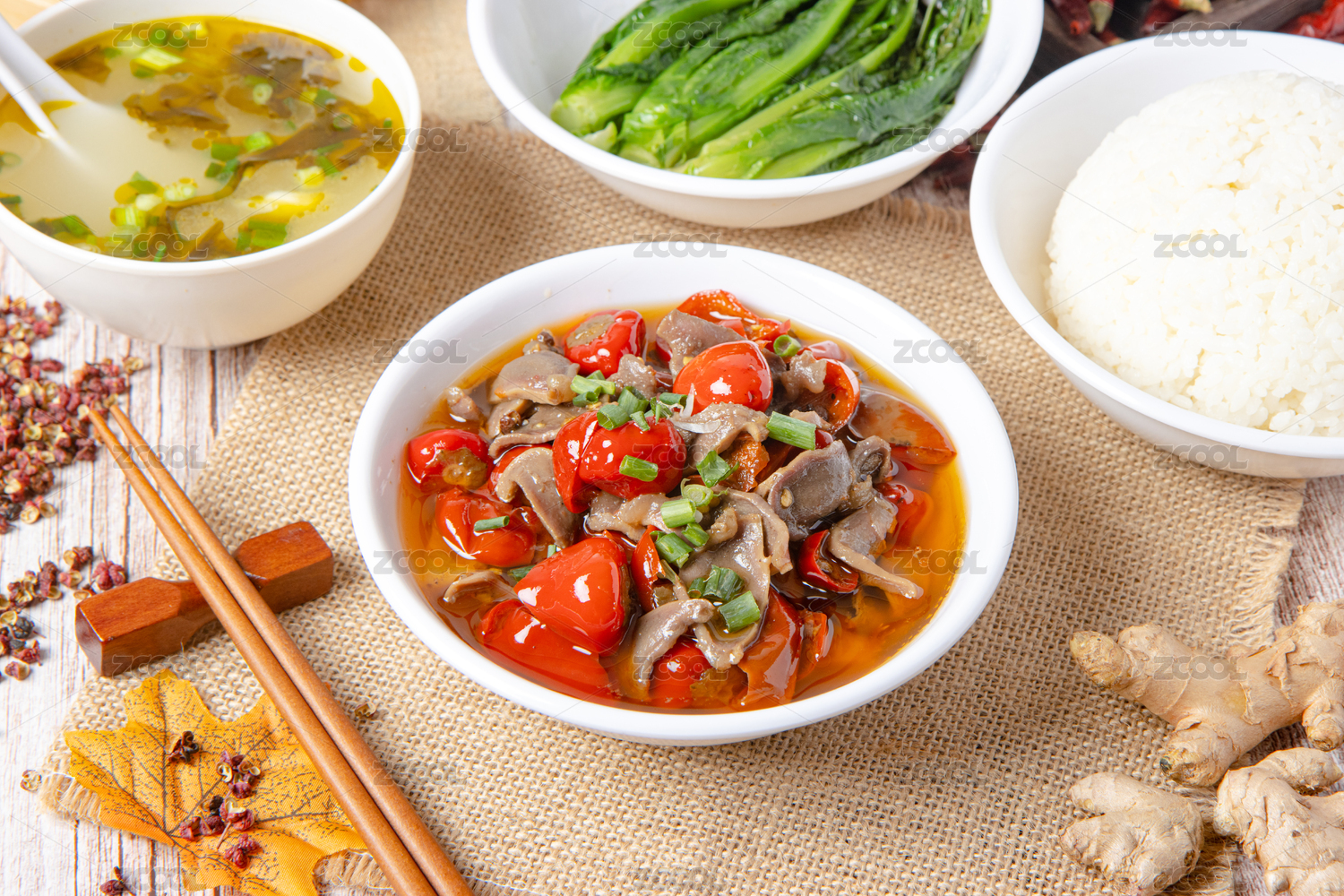 白色碗里的泡椒雞雜彩色玉米套飯