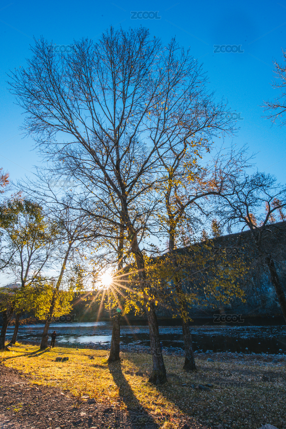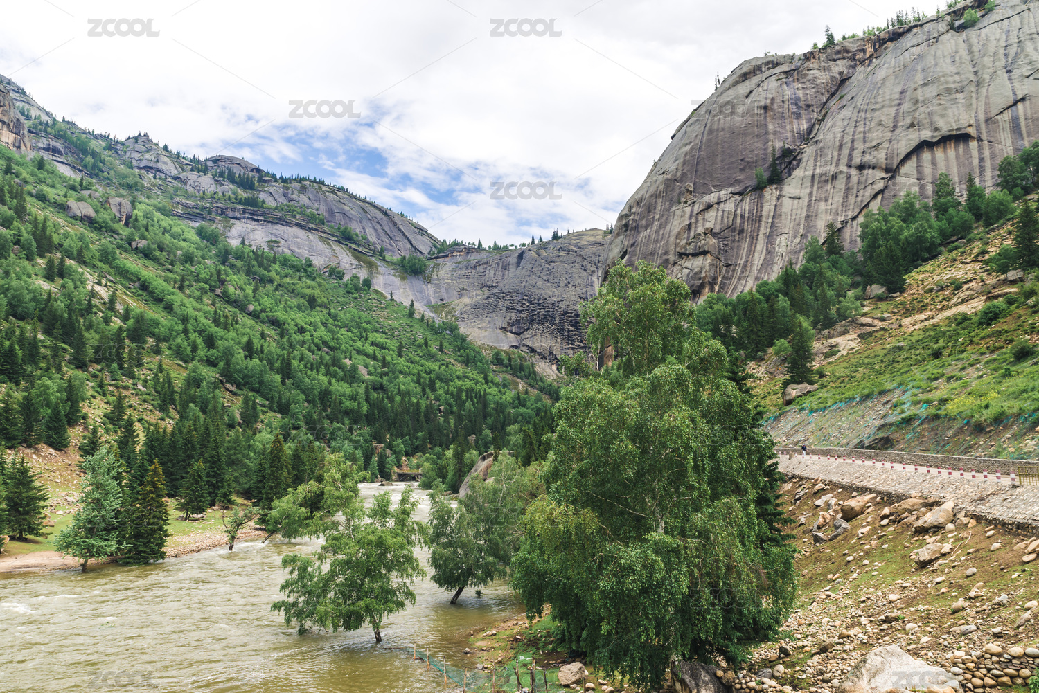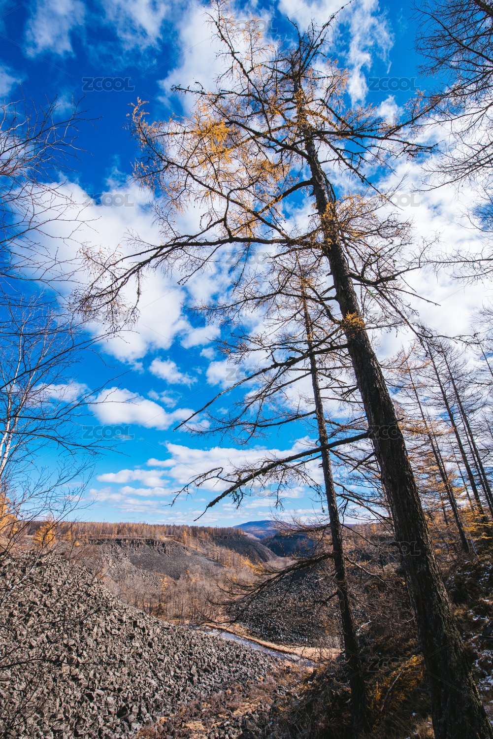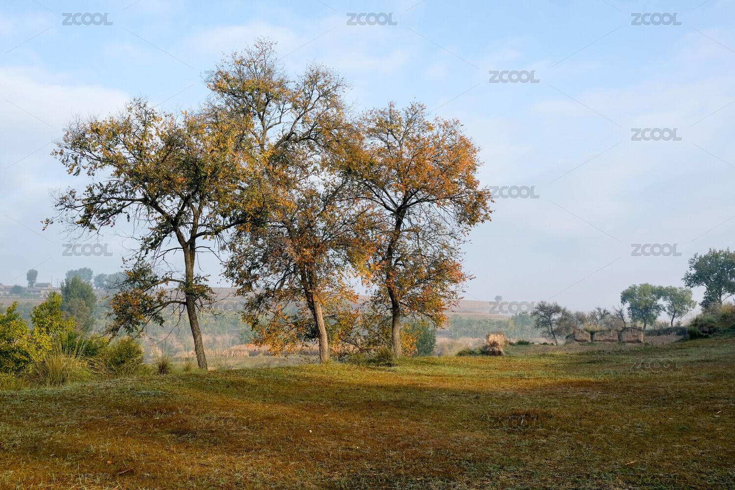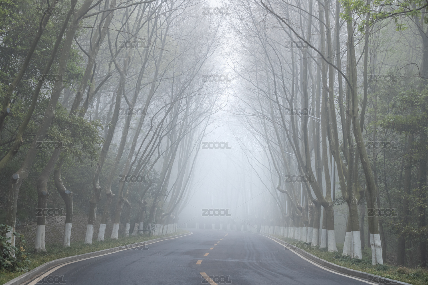霧中兩側(cè)排列高大樹木蜿蜒有標(biāo)志線的公路